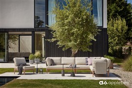 Venkovní modulová sedací sestava z přírodního teaku s lankovým výpletem od značky Apple Bee. Díky flexibilním opěrkám lze z dílů vytvořit nekonečně mnoho kombinací.