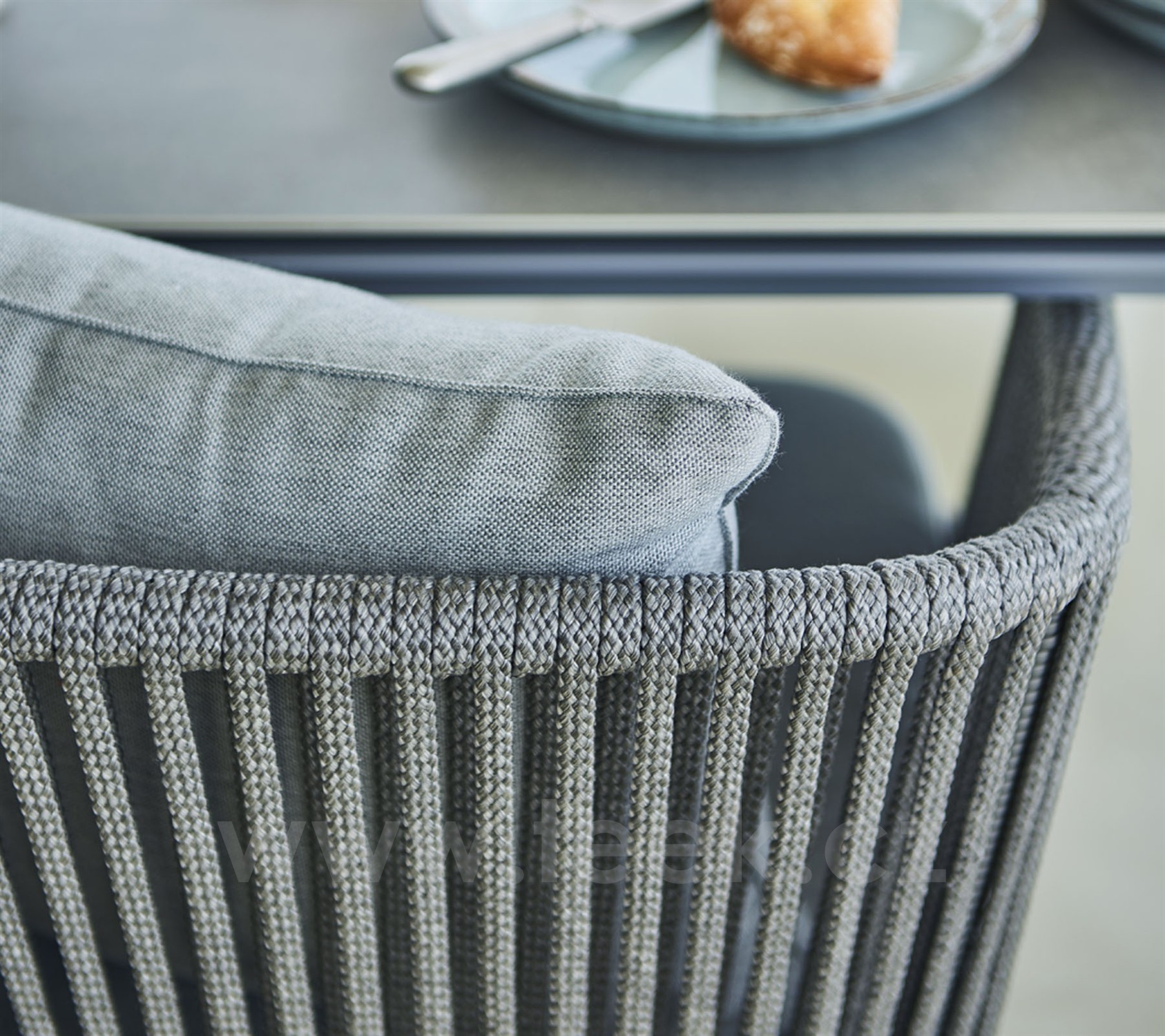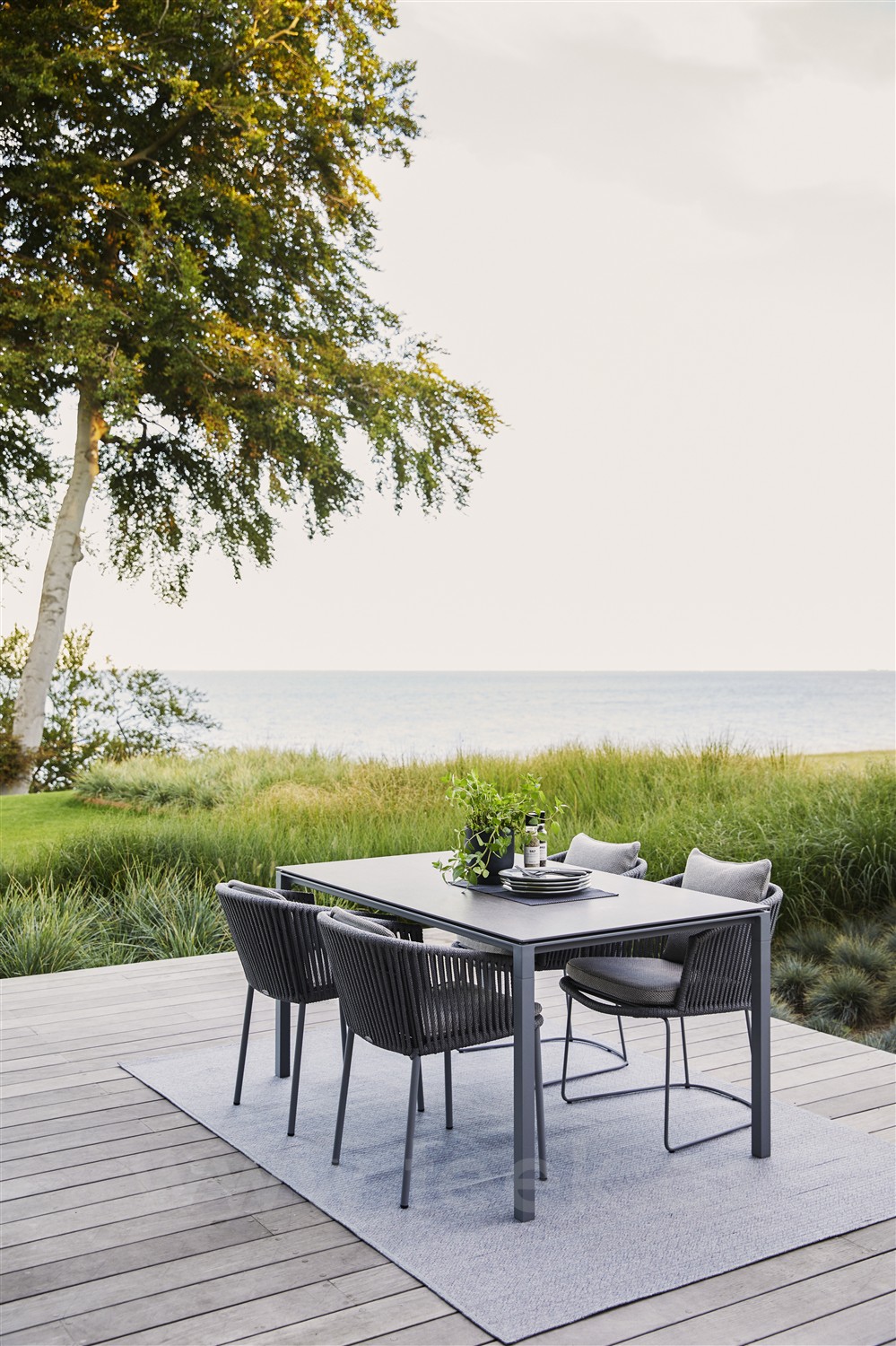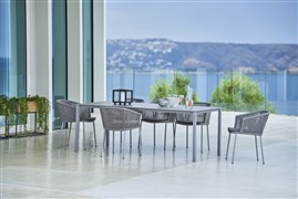 Beliebtes Outdoor-Essmöbel mit Seilgeflecht von Cane Line. Das Essmöbel lässt sich mit dem Sitzmöbel Moments Lounge kombinieren.