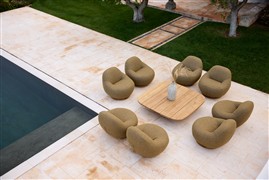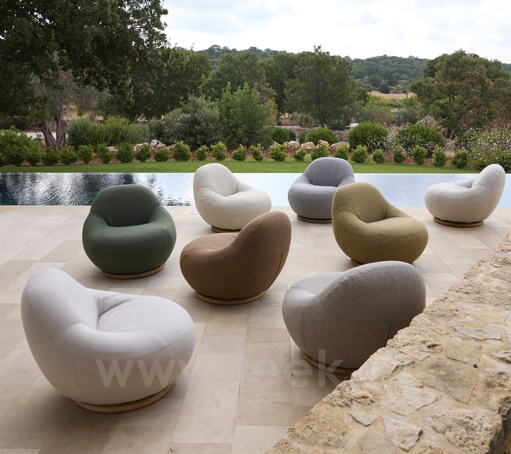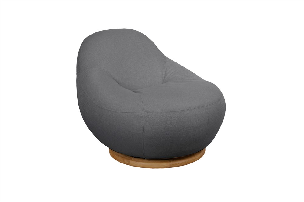 Der Sessel ist vollständig gepolstert und mit einem drehbaren Sockel aus Teakholz gefertigt.
