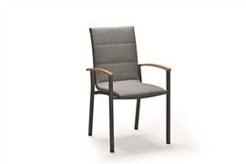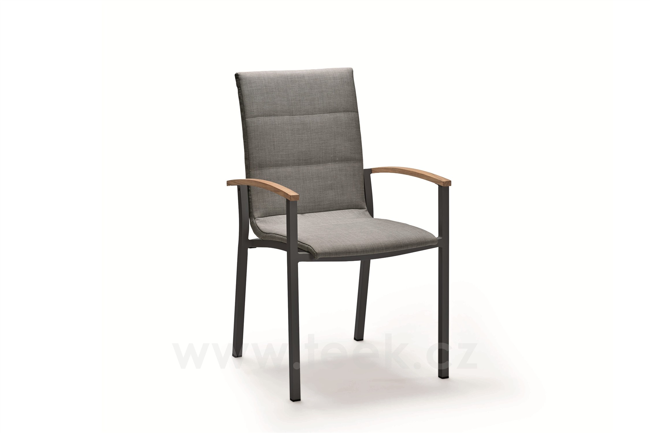 Stackable padded dining armchair Mick, Stern, 62x55x96 cm, frame lacquered aluminum anthracite matt, weave Chia light, armrests teak