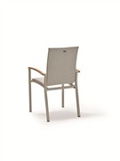 Stackable padded dining chair Mick, Stern, 62x55x96 cm, frame lacquered aluminum Greige, weave Sesame light, armrests teak