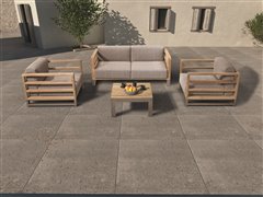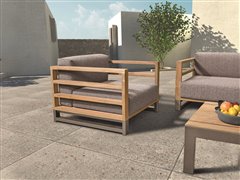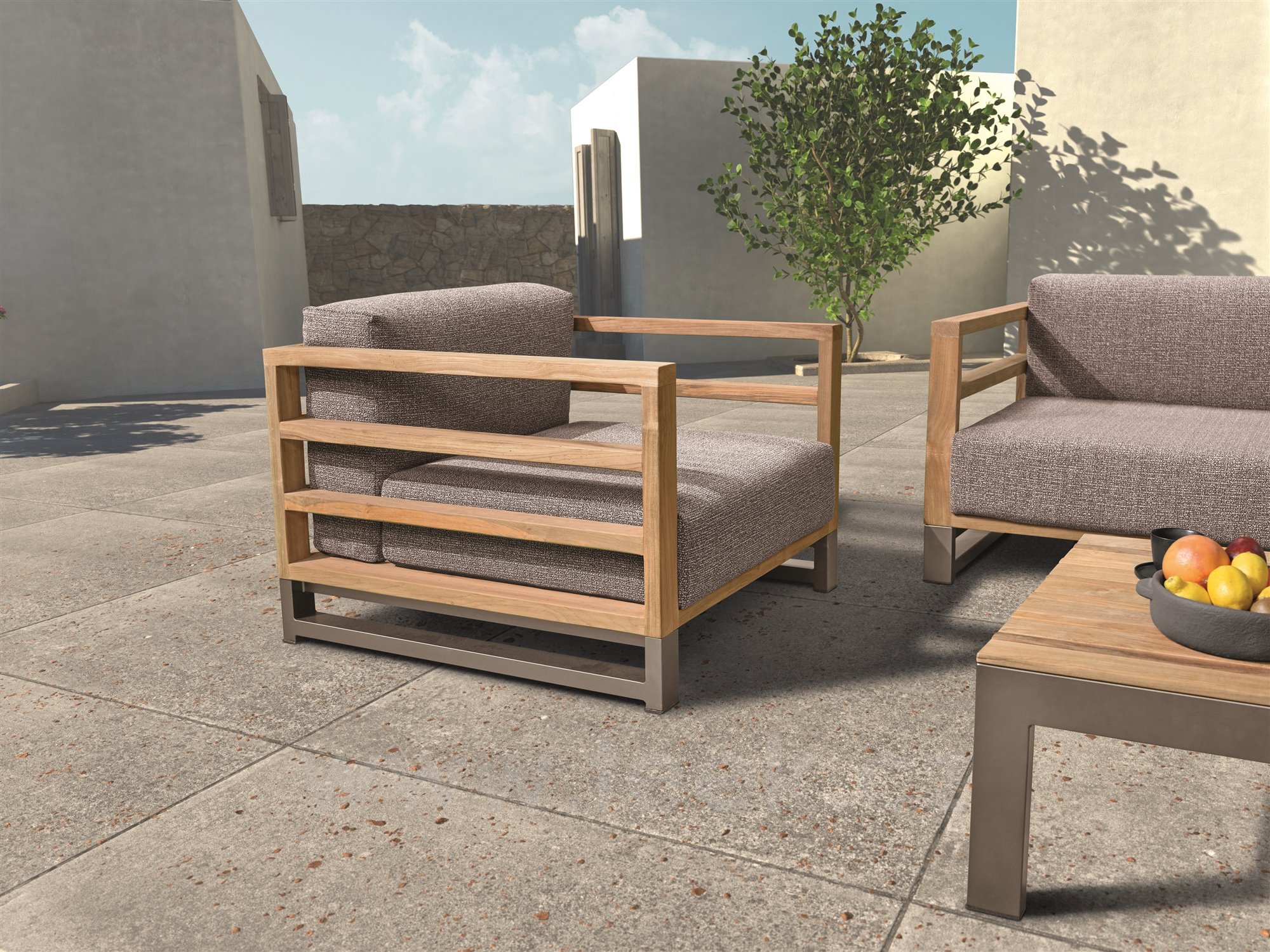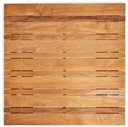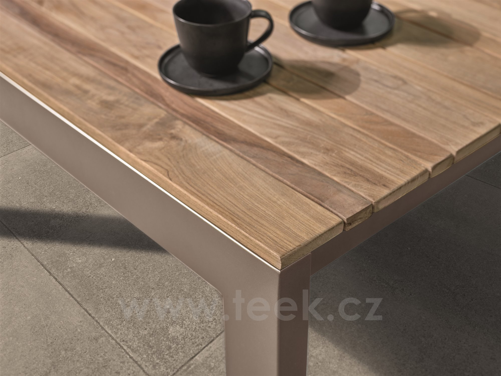 Die Tischplatte besteht aus natürlichem Teakholz.