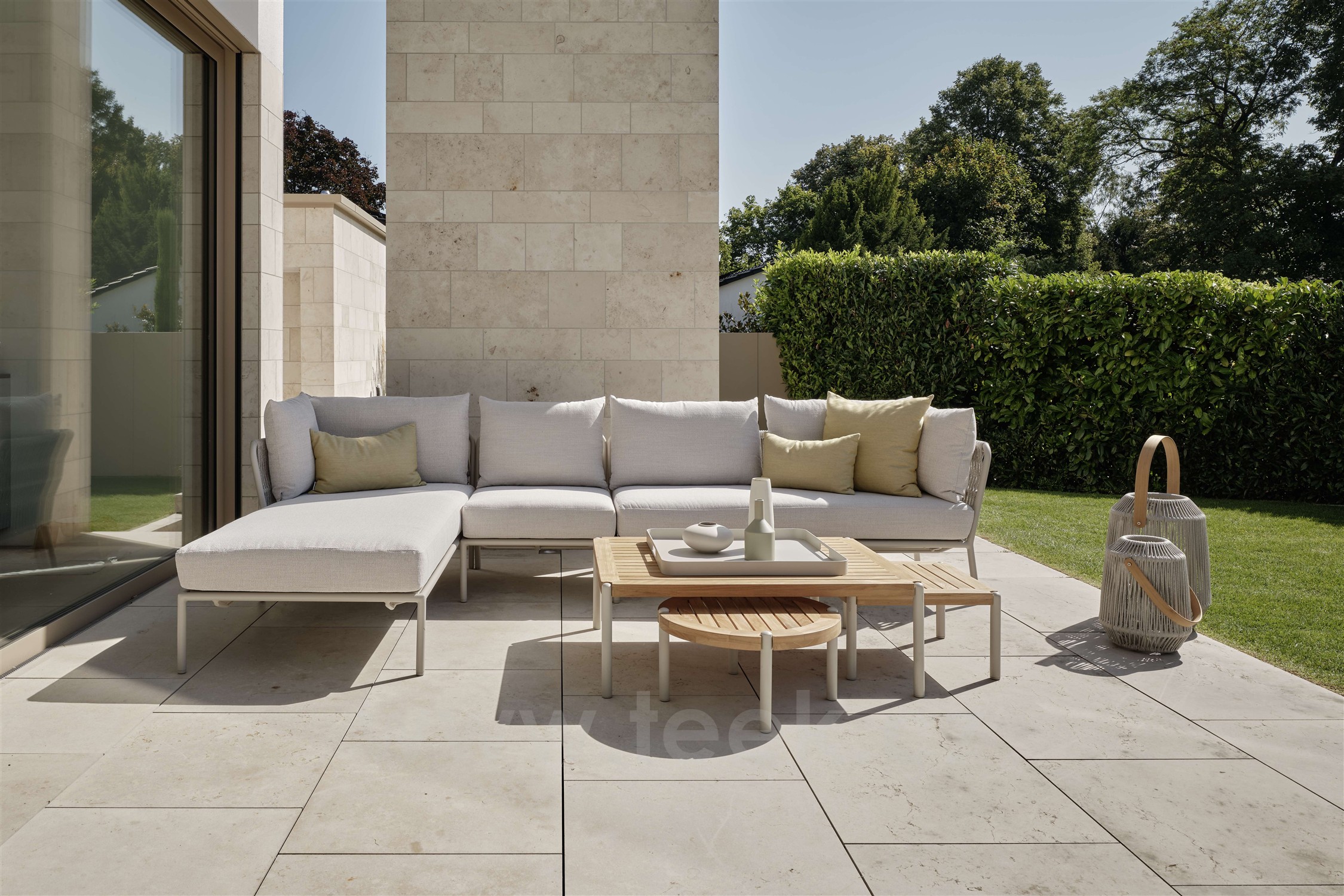 2-místný ukončovací díl levostranný Romy, Stern, 161x75x82 cm, rám lakovaný hliník Greige, lankový výplet Greige, sedáky venkovní látka Lychee