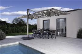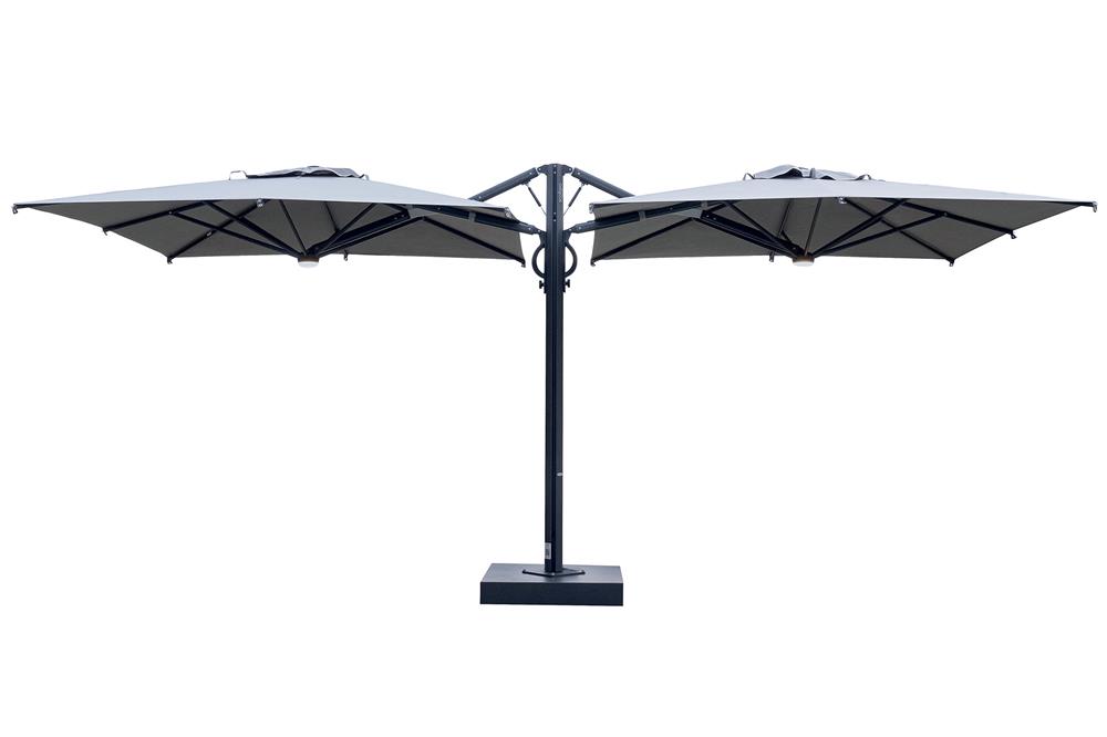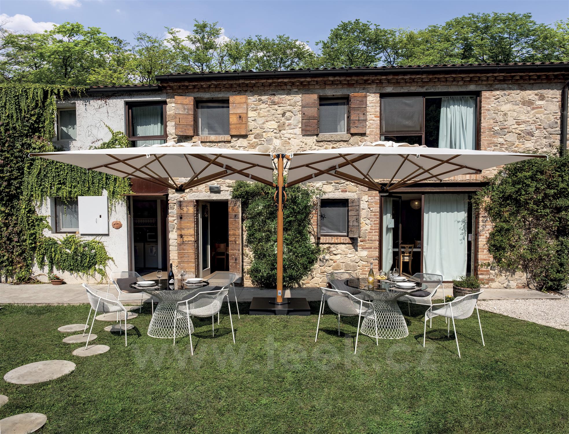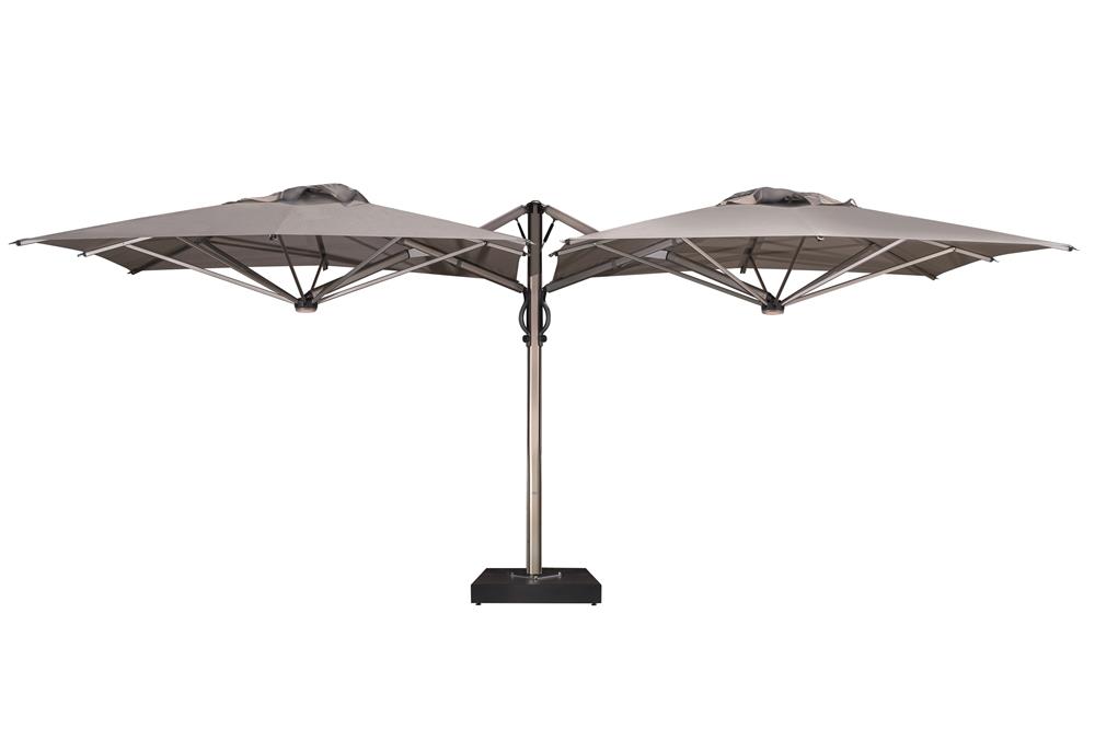 Evoluce samostatného slunečníku Astro s inovativním systémem otevírání a zavírání asistovaným plynovou pružinou. Zasouvací konstrukce umožňuje otevírání a zavírání nad stoly a židlemi bez nutnosti přesouvat nábytek. Vhodný do všech prostředí a doporučený zejména pro komerční využití (bary, restaurace, hotely či terasy). Hliníkový rám. Robustní konstrukce složená ze dvou slunečníků vedle sebe, ukotvených na jednom společném nosiči.
