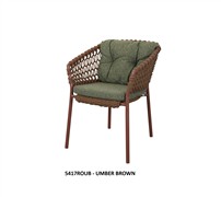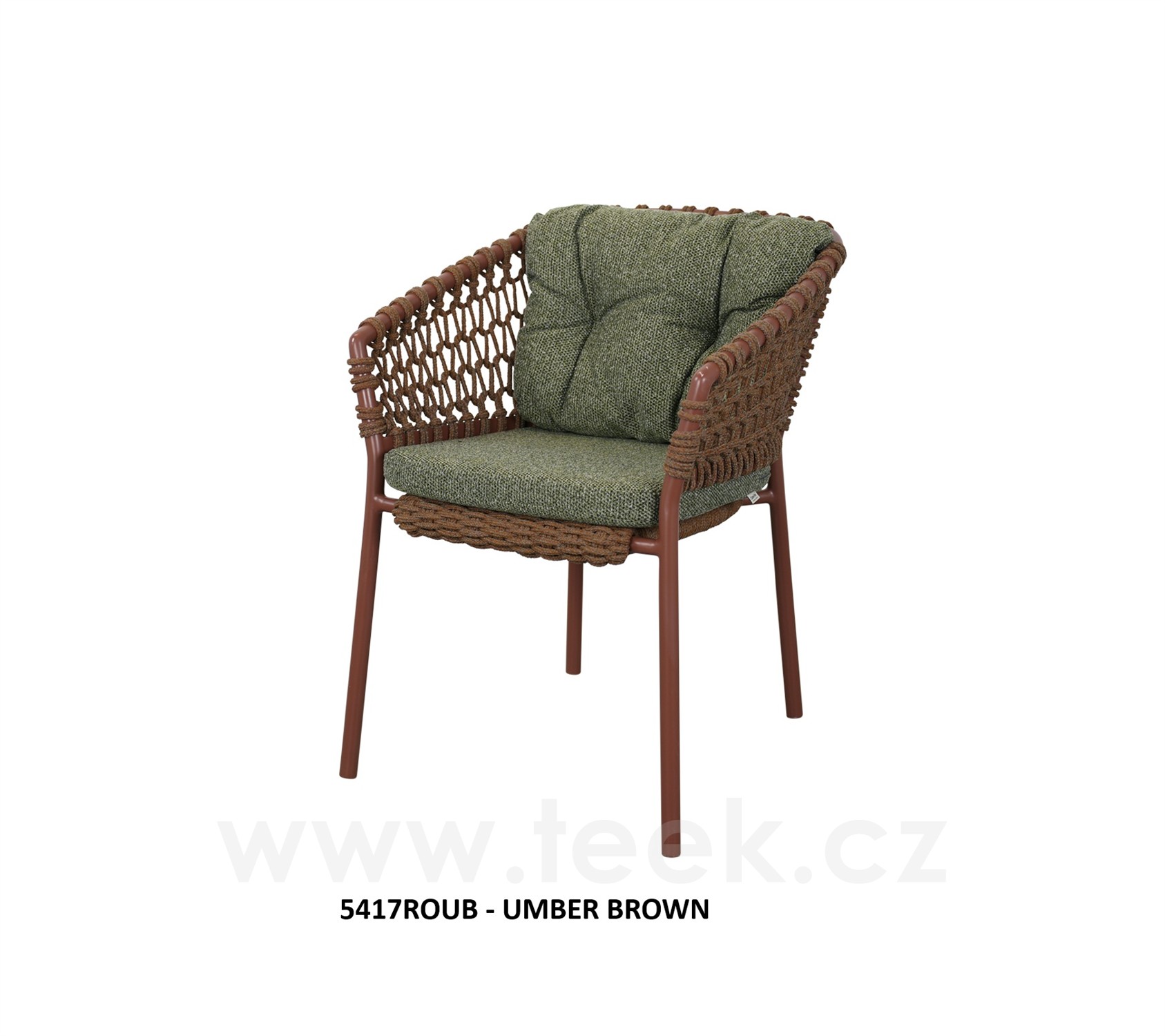 Ocean stackable dining armchair by Cane-line, 59 × 63 × 76 cm, featuring an aluminium frame with Soft Umber Brown rope weave, supplied without cushions.