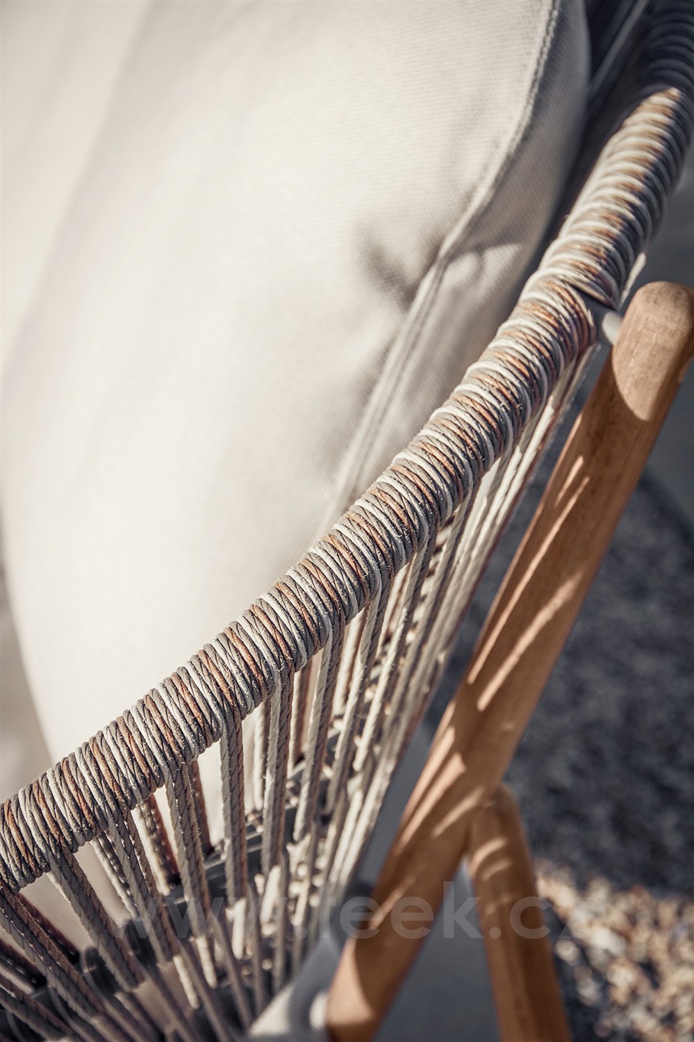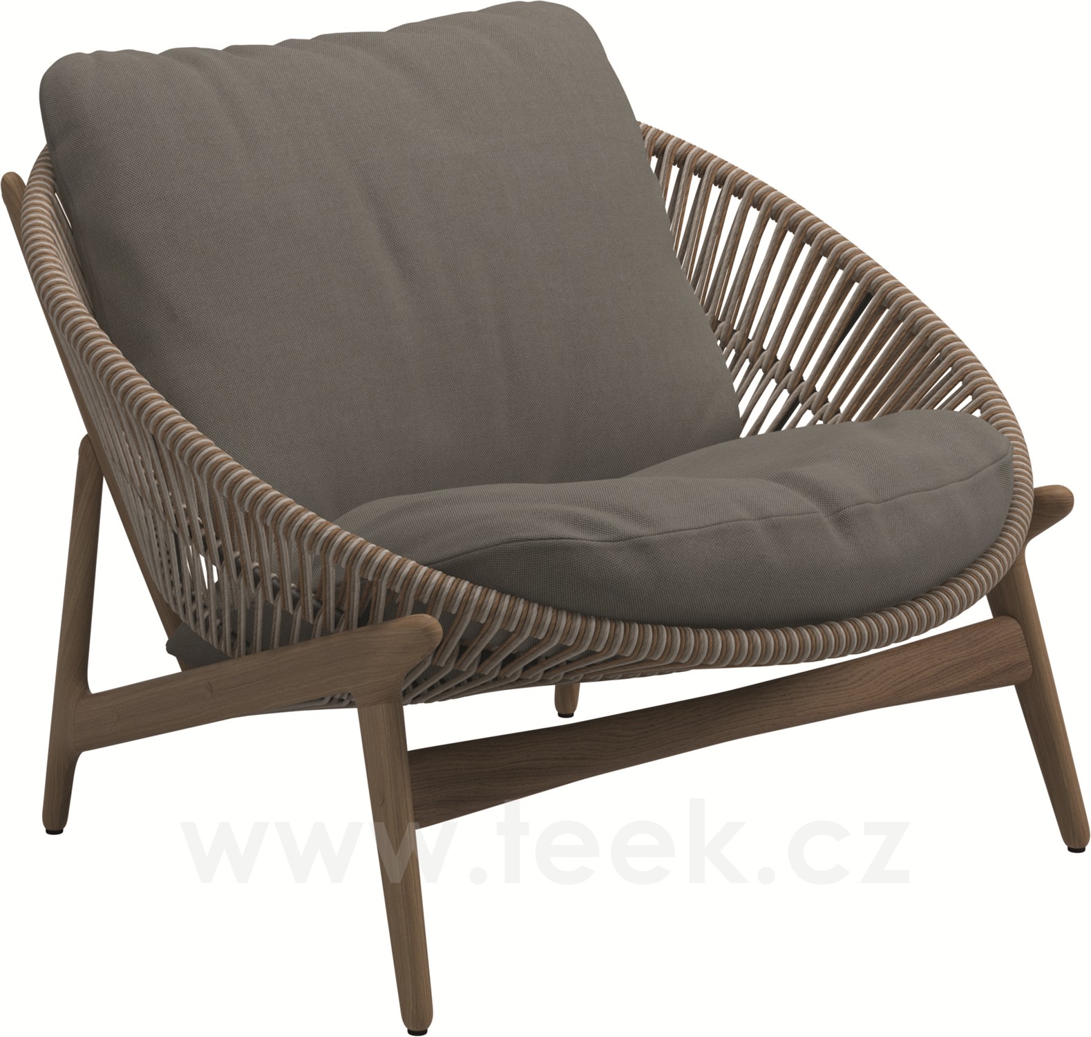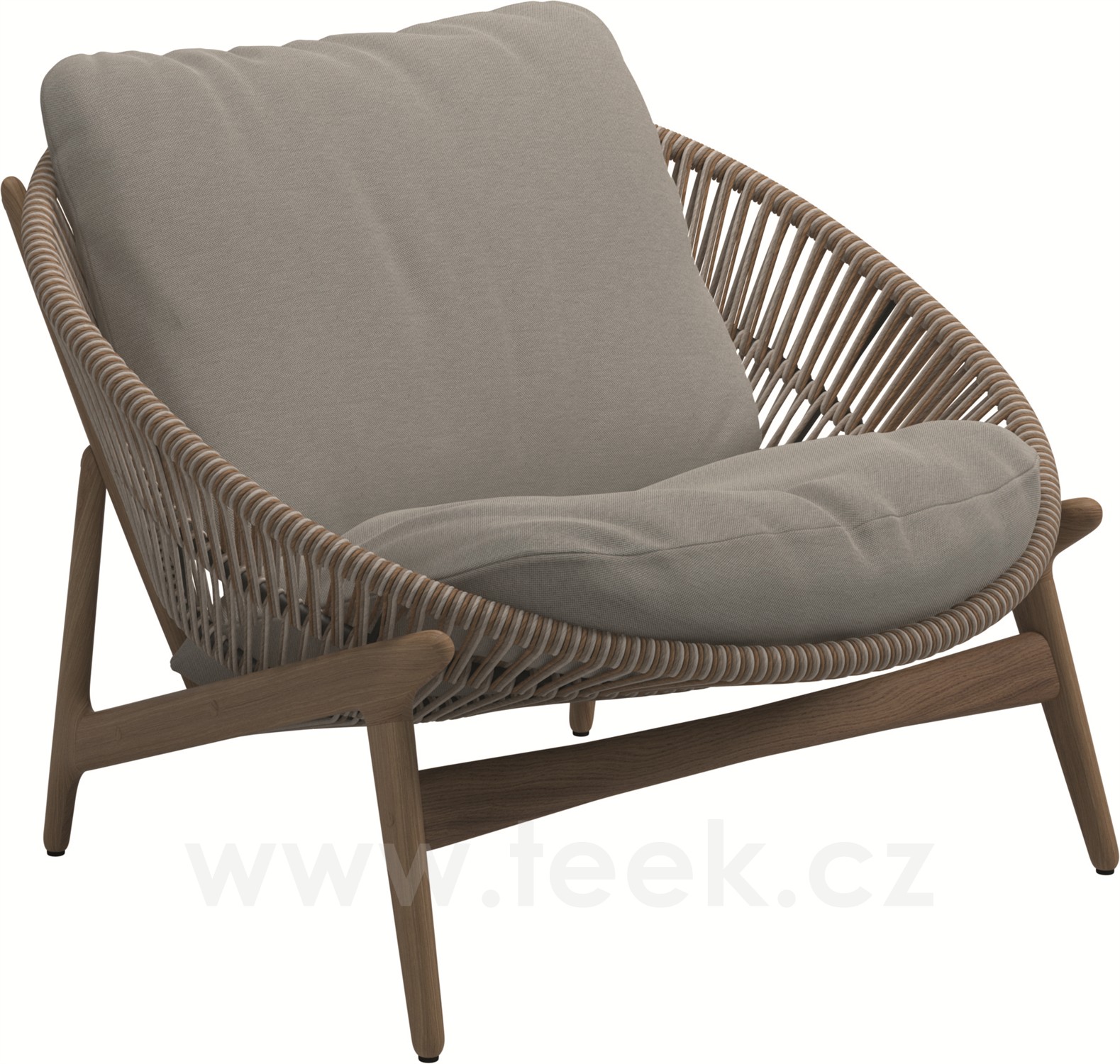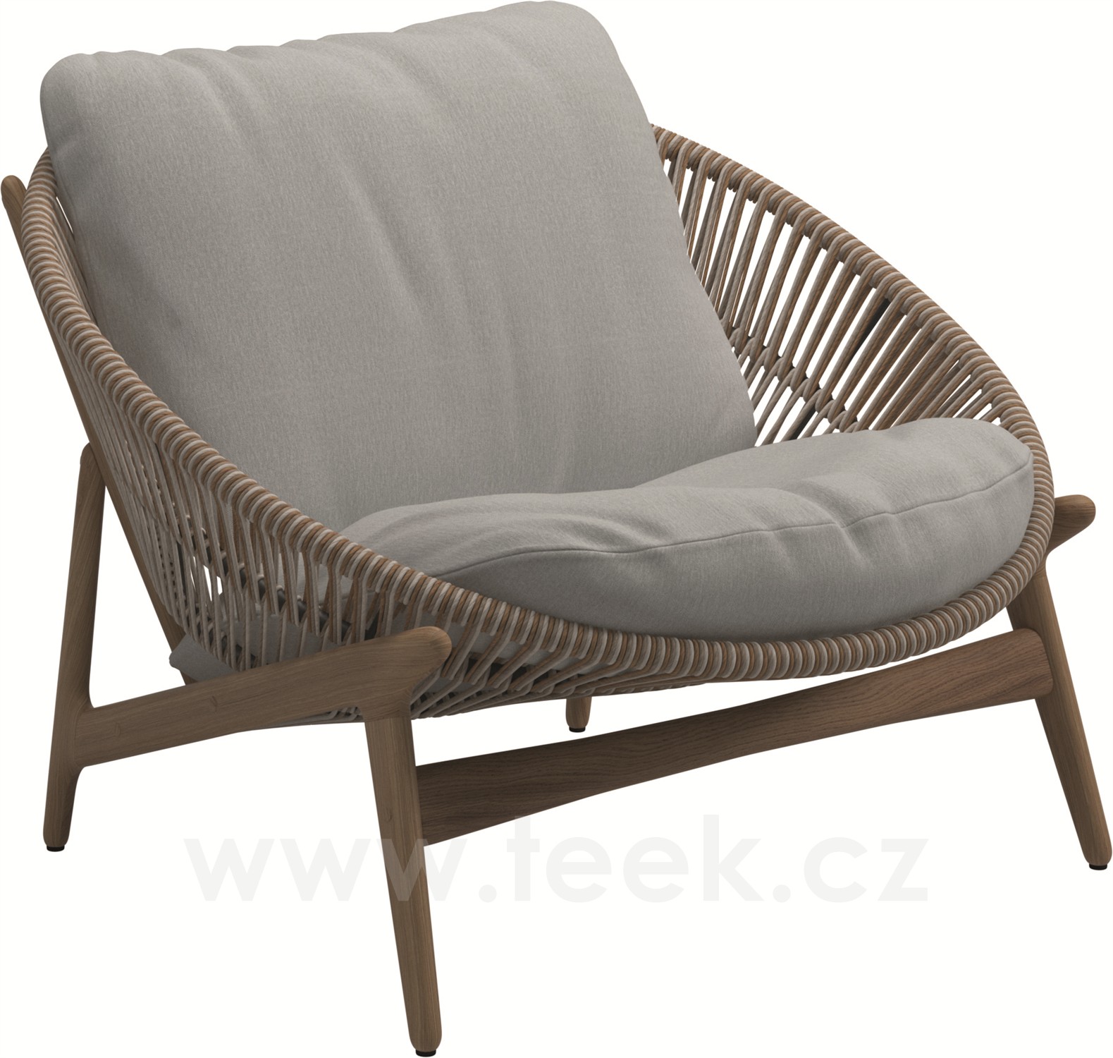 Low chair Bora, Gloster, 97.5x97x73.5 cm, teak frame, light Sorrel synthetic rattan weave, cushions cat. D color according to the sample book