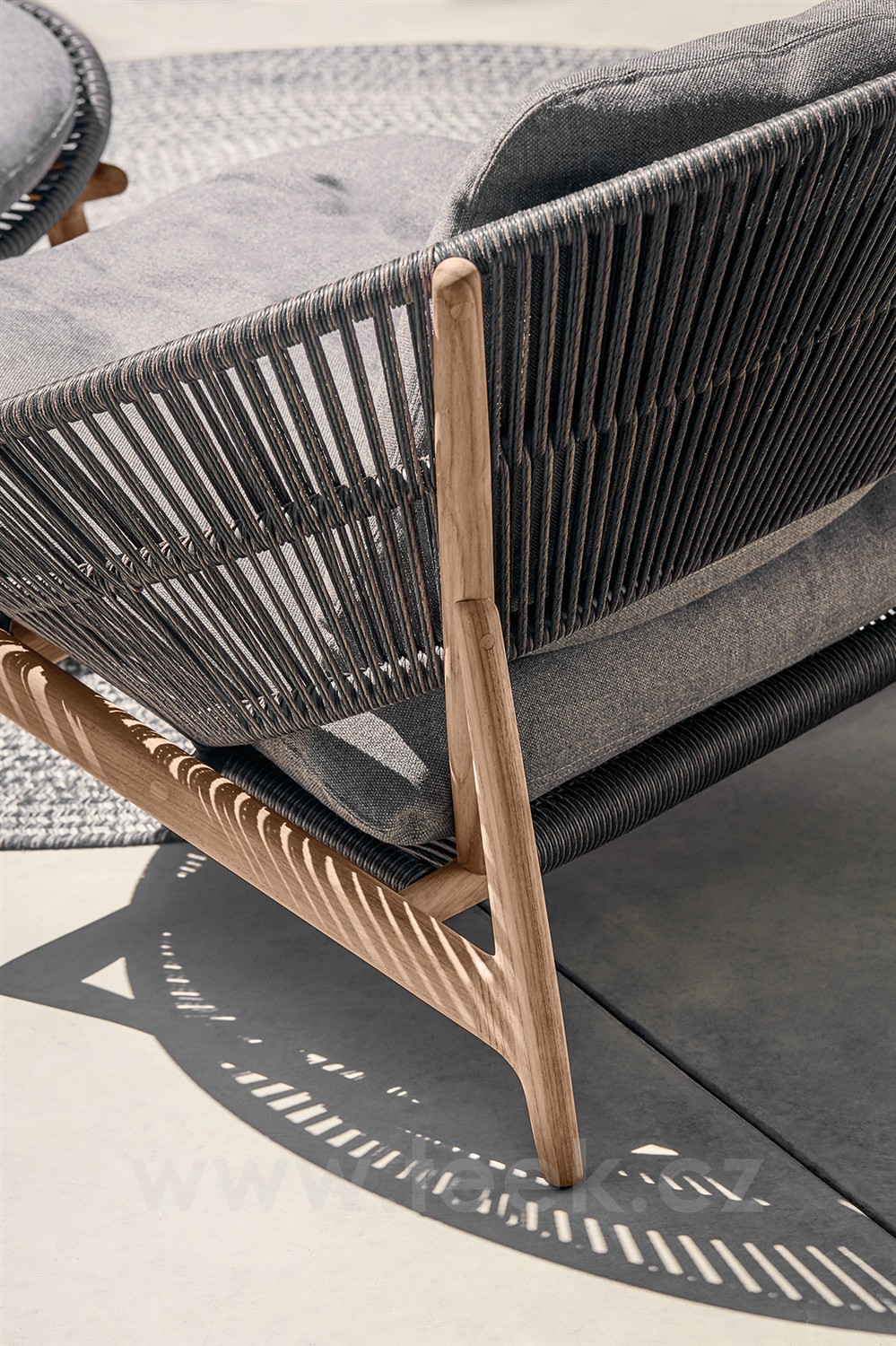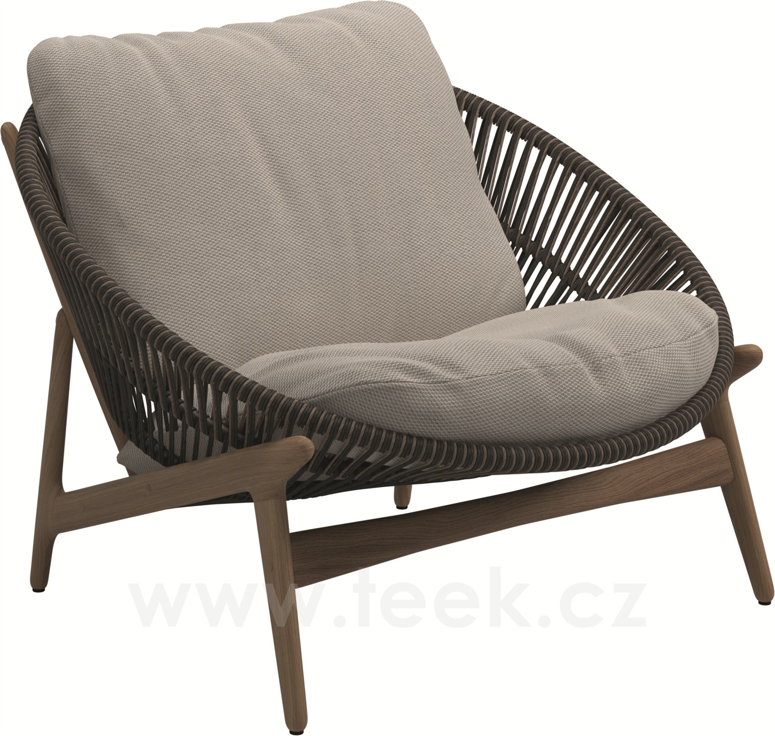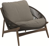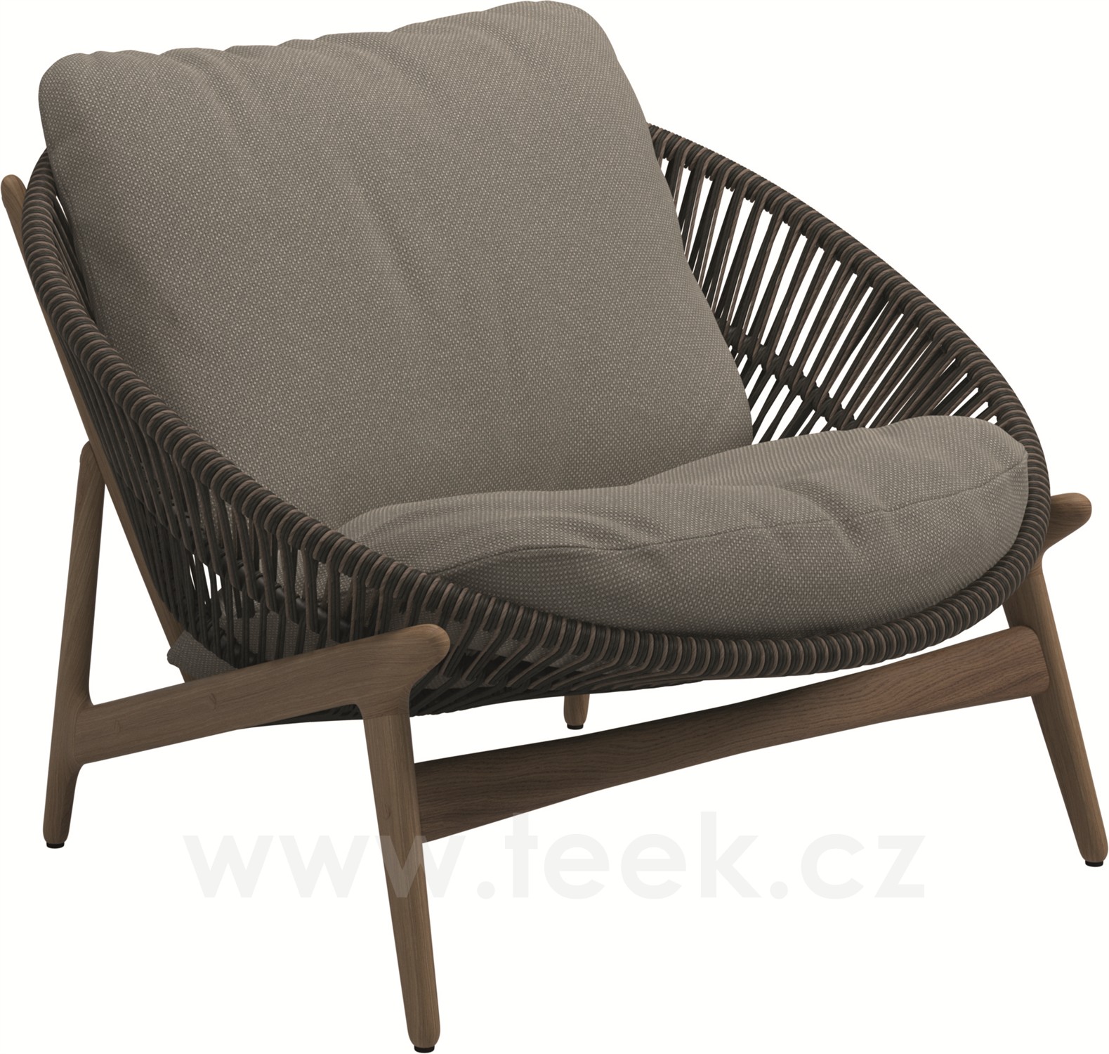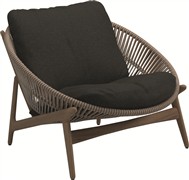 Low chair Bora, Gloster, 97.5x97x73.5 cm, frame teak, weave synthetic rattan dark Umber, cushions cat. D color according to the sample book