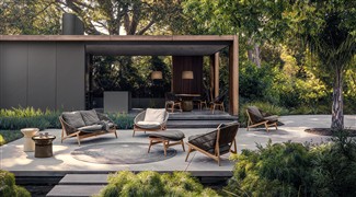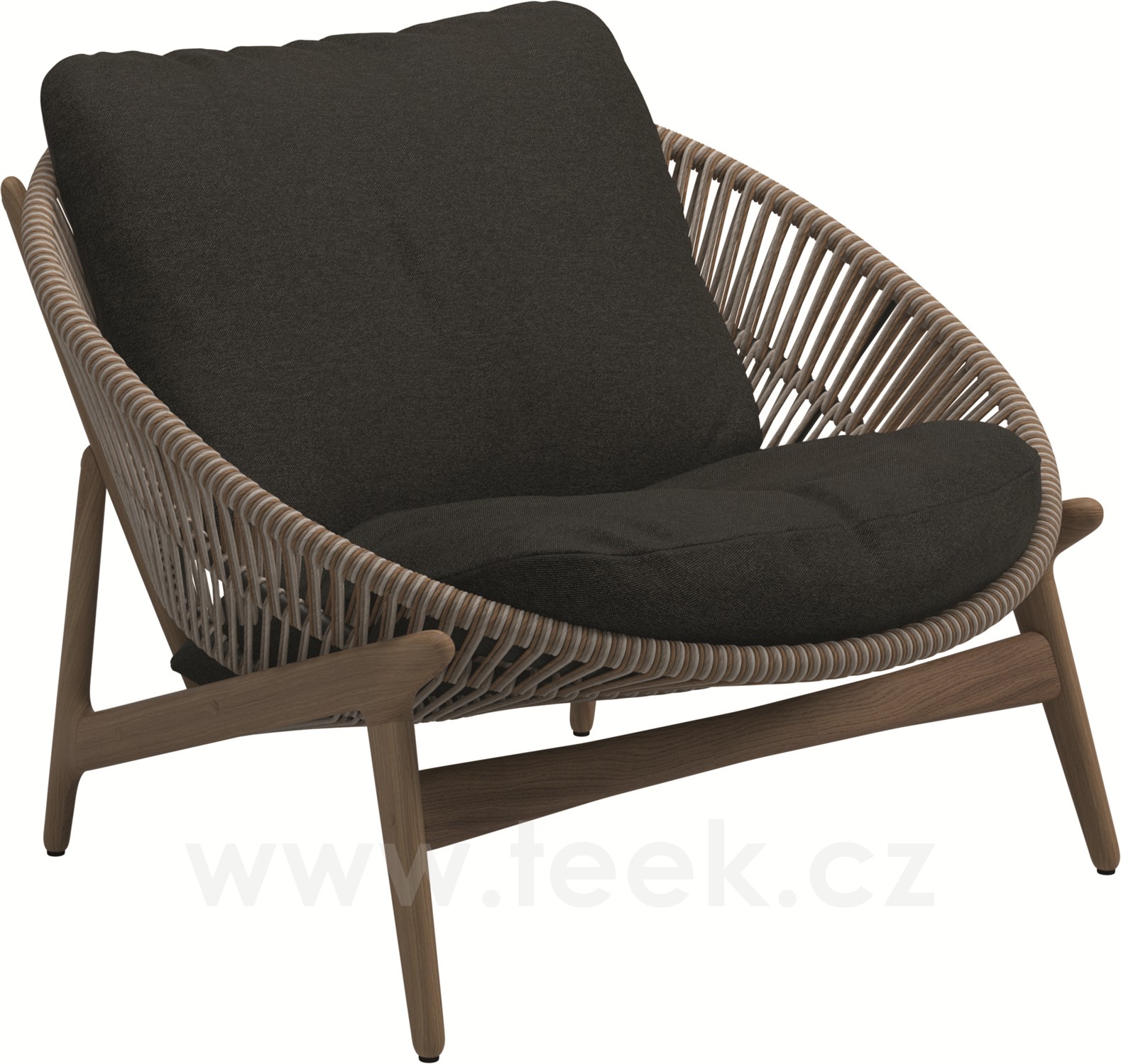 Low chair Bora, Gloster, 97.5x97x73.5 cm, teak frame, dark Umber synthetic rattan weave, cushions cat. B color according to the sample chart