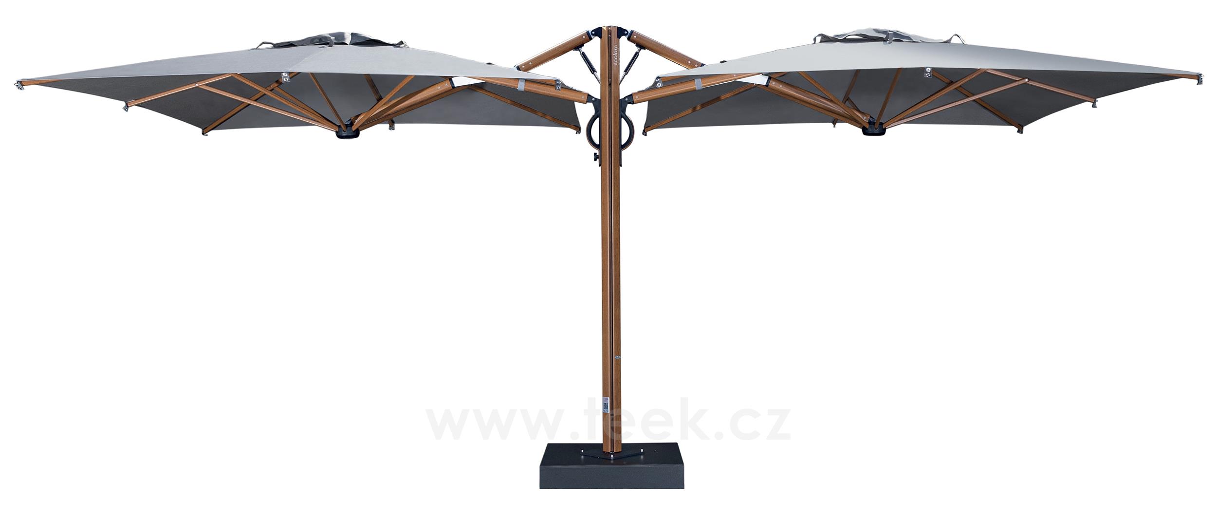 Double side umbrella Dual T, Scolaro, 700x350 cm, frame aluminium, wood decor Iroko, acrylic cover 350 g/m2, colour according to the swatch book