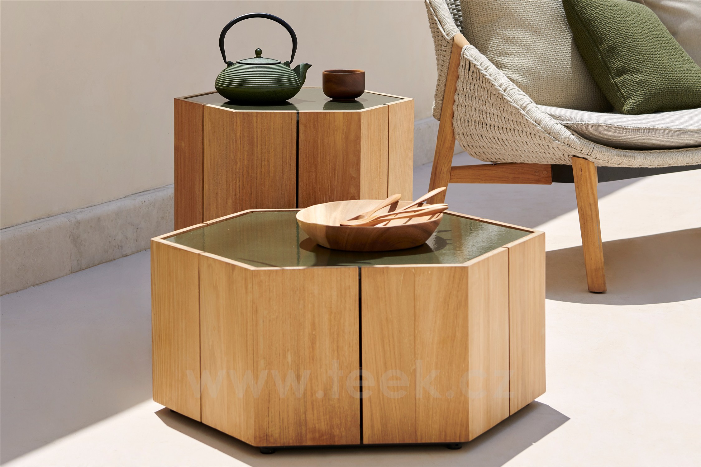 Odkládací stolek Hexagon, Tribu, 50x49 cm, rám teak, deska glazovaný lávový kámen barva moss