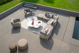Coffee table Cala, Jati Kebon, oval 95x95x42 cm, aluminium, dune matt, cable, linnen, ceramic Chianca