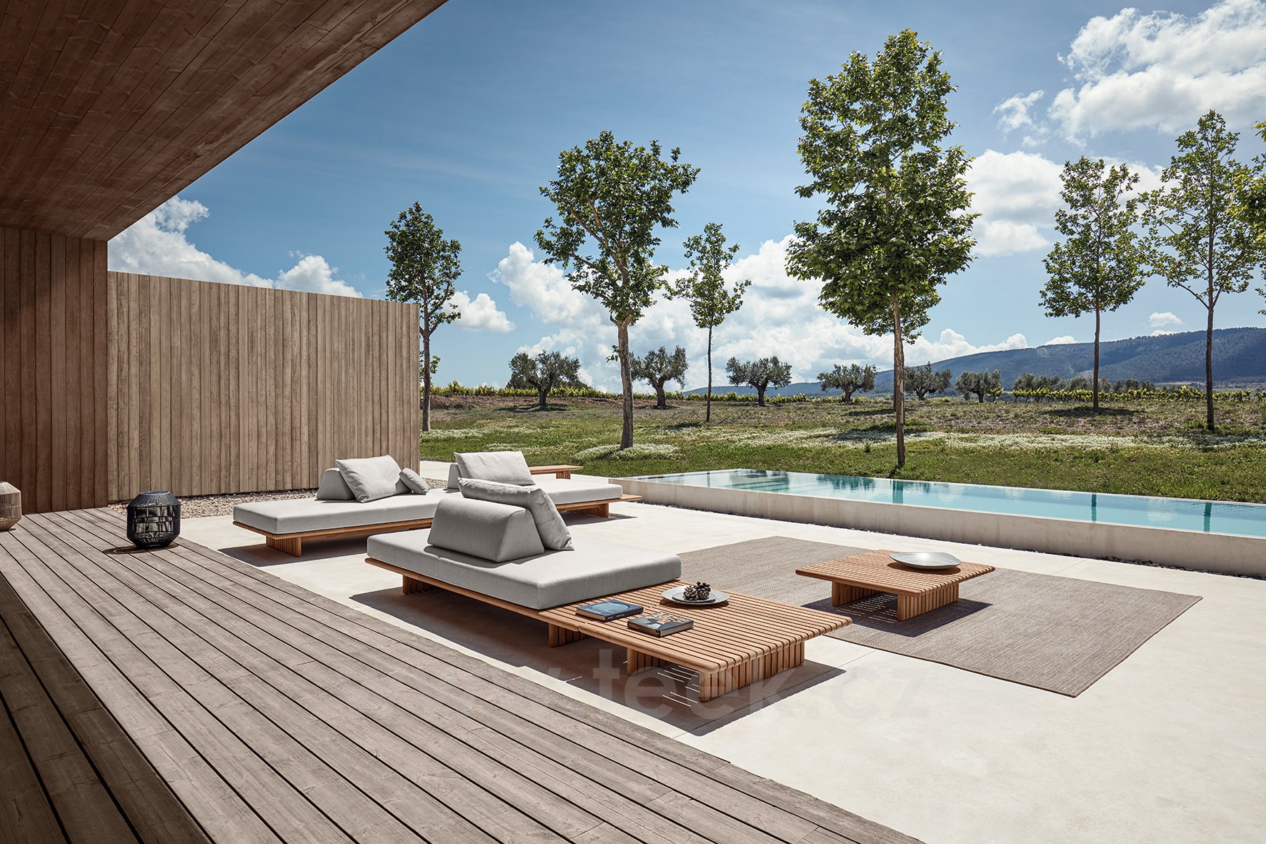 Modulový díl Deck, Gloster, 223x125x99 cm, rám teak, včetně sedáku, setu opěrných polštářů a krycí plachty, venkovní látka kat. B