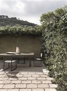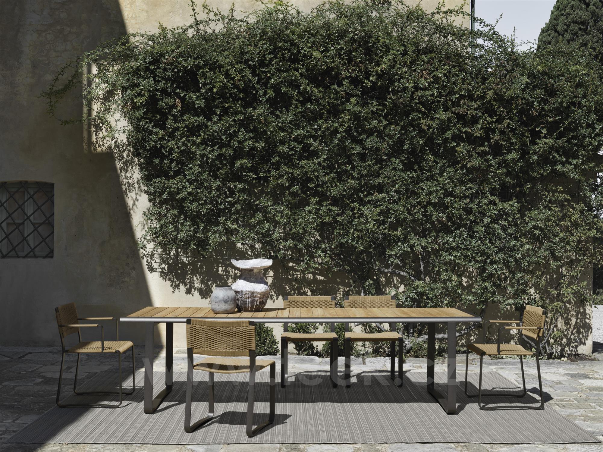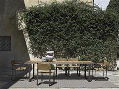Venkovní jídelní stůl s latkovou deskou pro odtok vody, vhodný pro 6 nebo 8 osob. Kombinuje pečlivě kalibrované proporce, design bez ostrých hran a motiv patinovaného hliníku typický pro Timeout Collection. Deska dostupná ve dvou verzích: masivní teak nebo lávový kámen (antracit, olivově zelená, desert yellow).