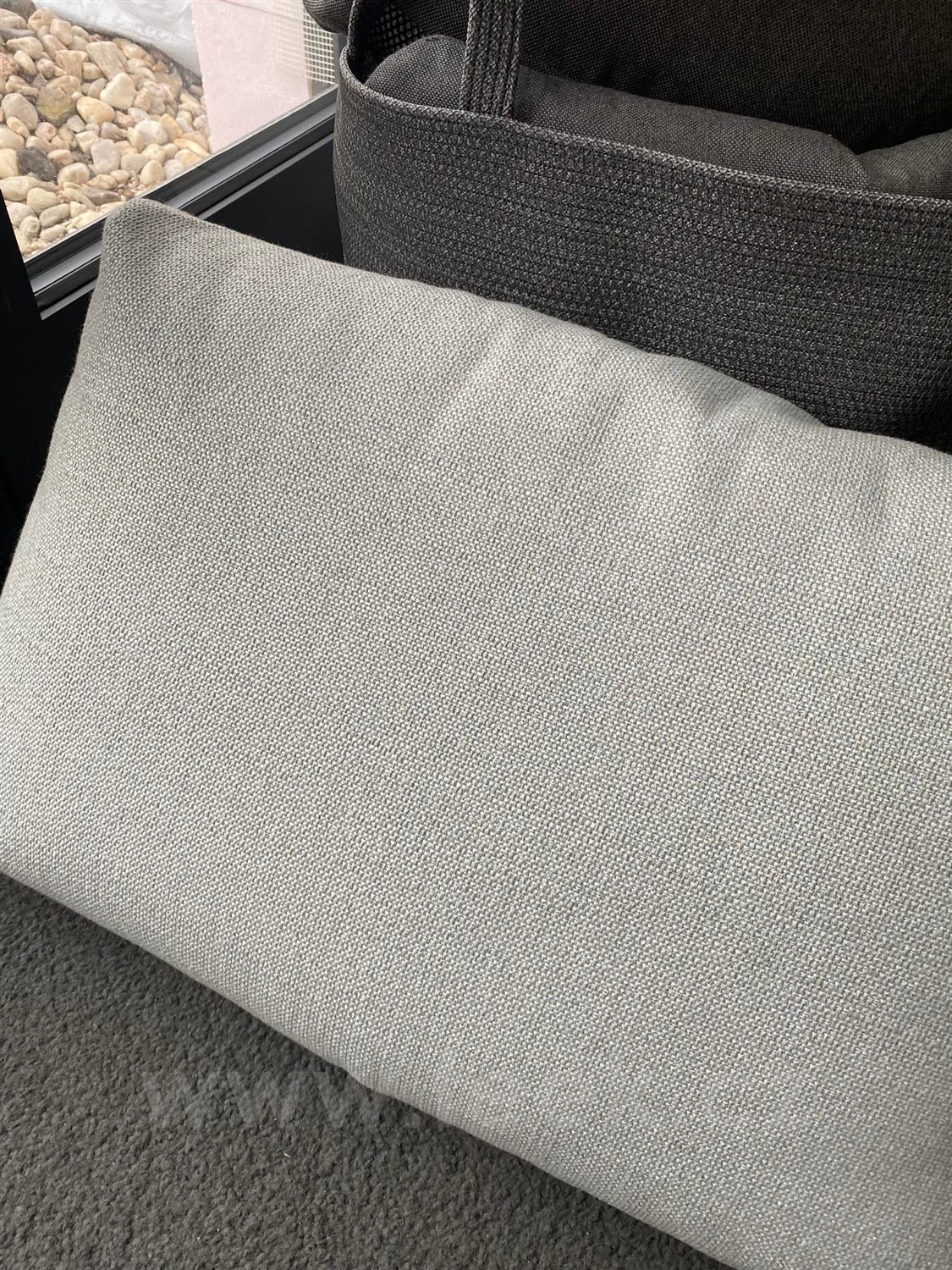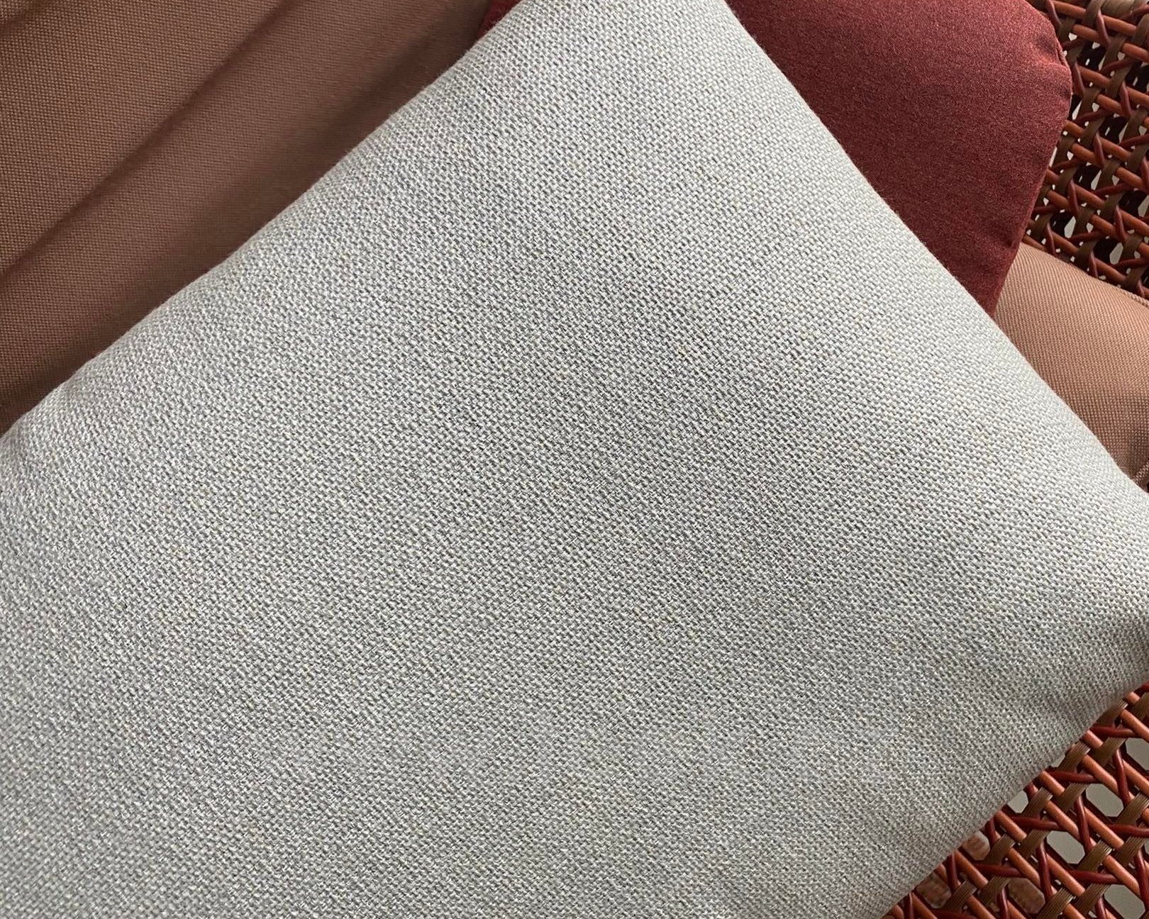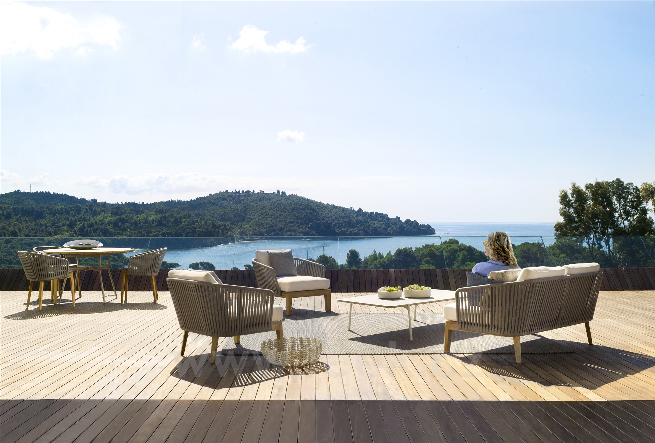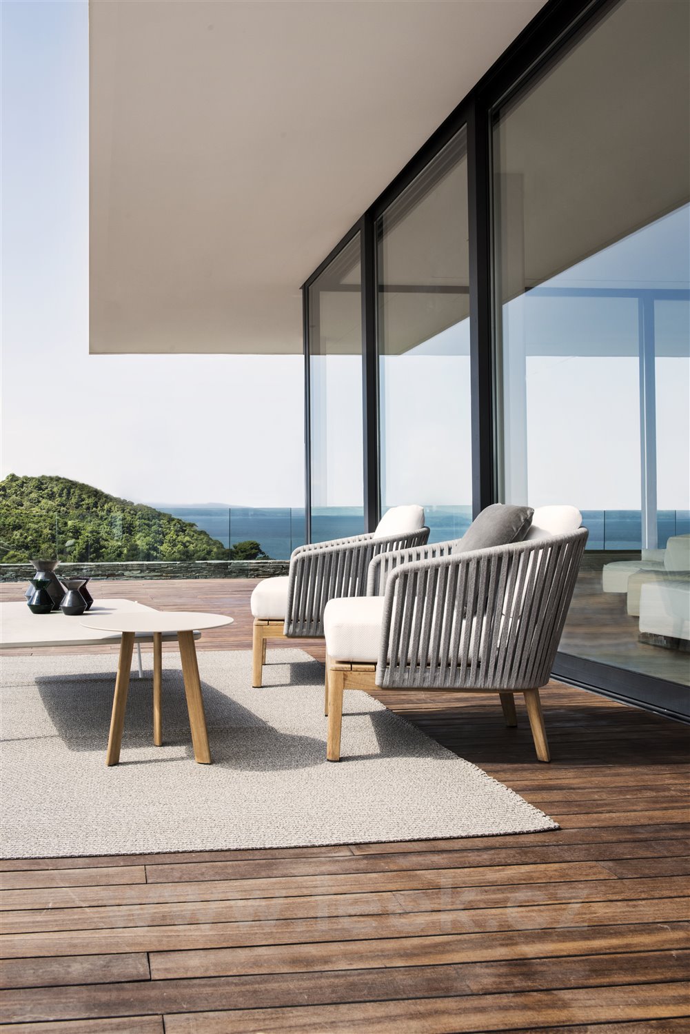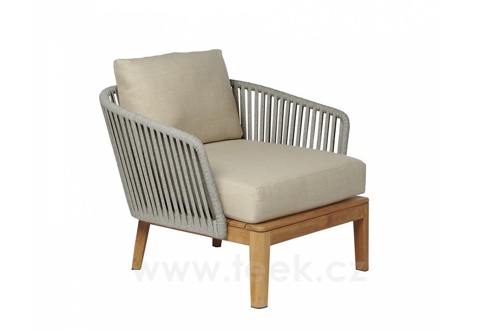 Nízké venkovní křeslo Mood značky Tribu z teakového dřeva se širokým lankovým výpletem ve světle šedé barvě (neaktuální barva pro sezonu 2022) včetně venkovních sedáku a opěrného polštáře v šedomodré barvě (Revive Jaspe).