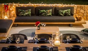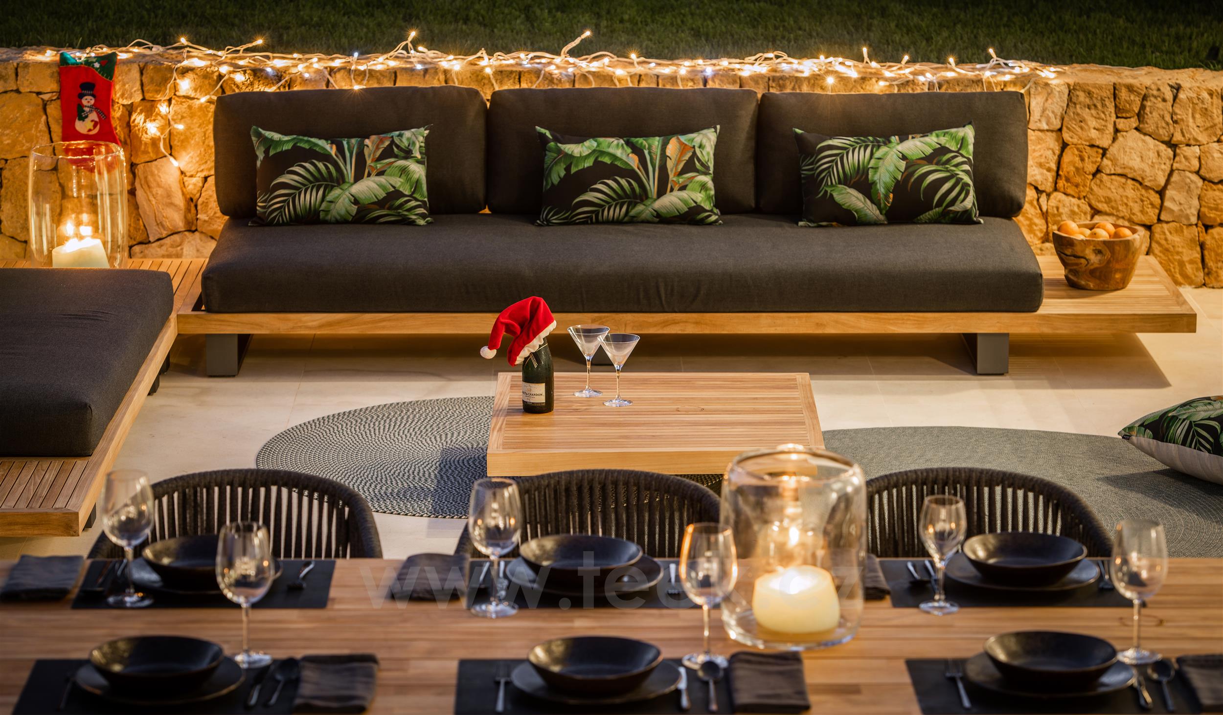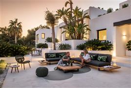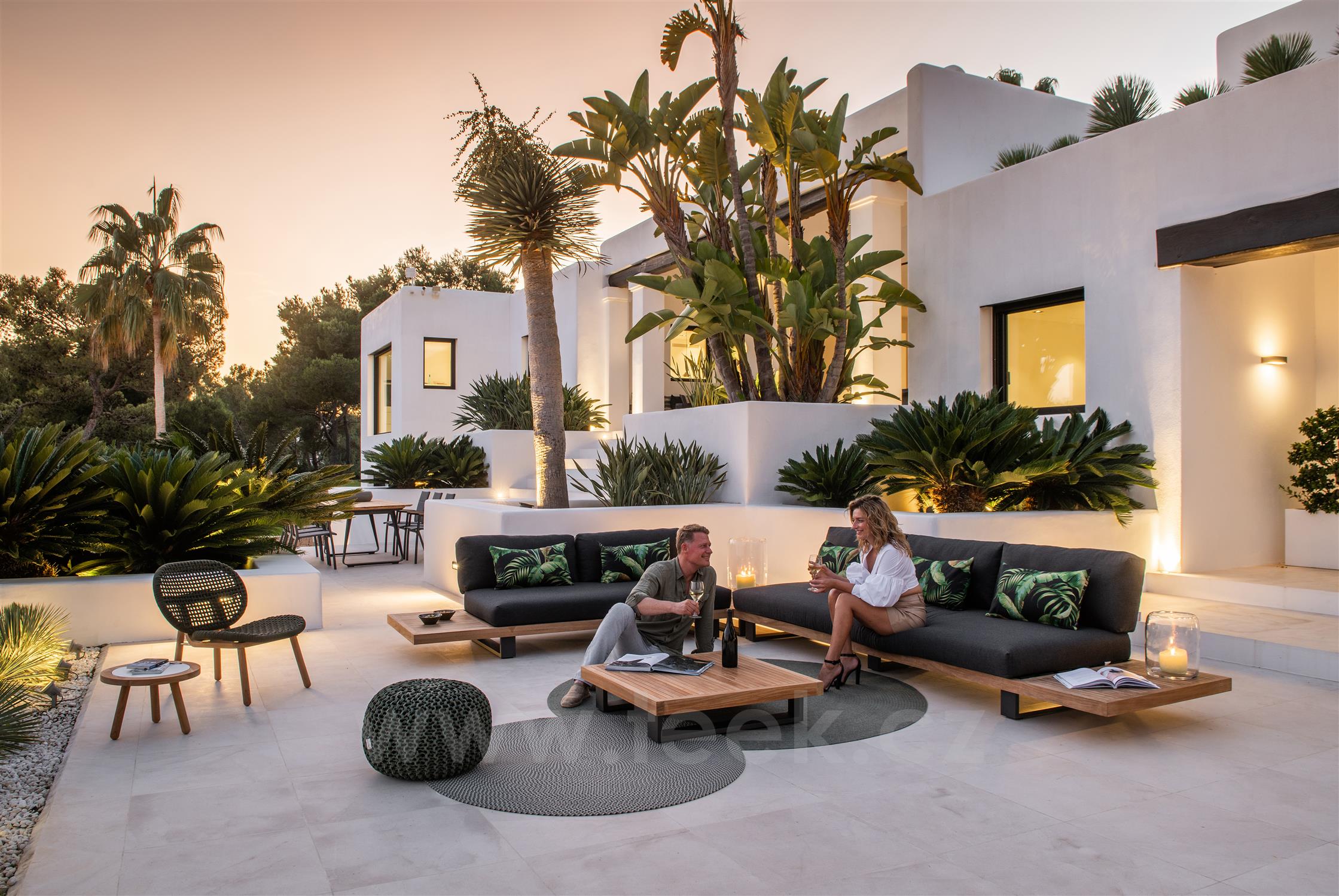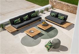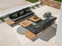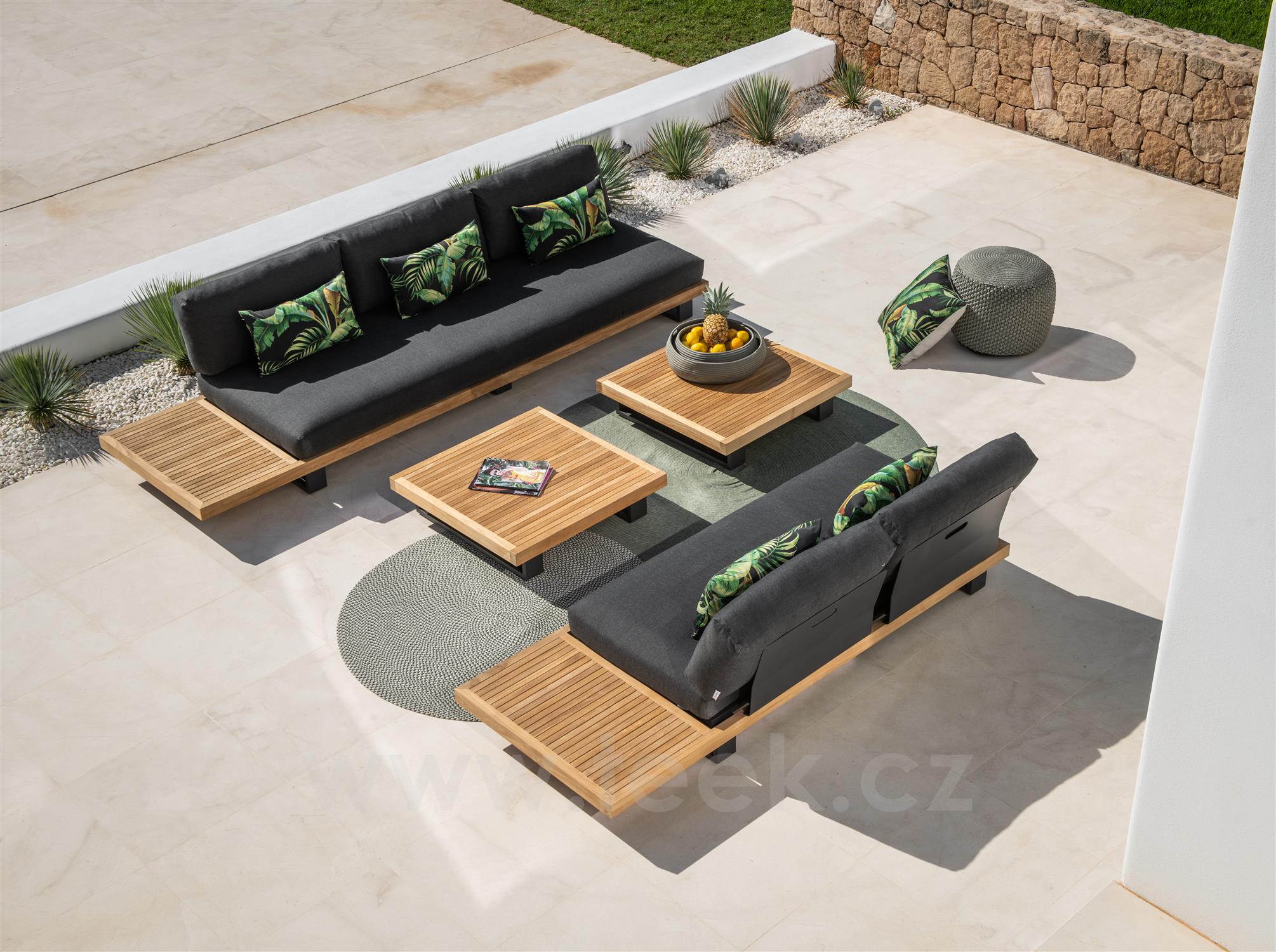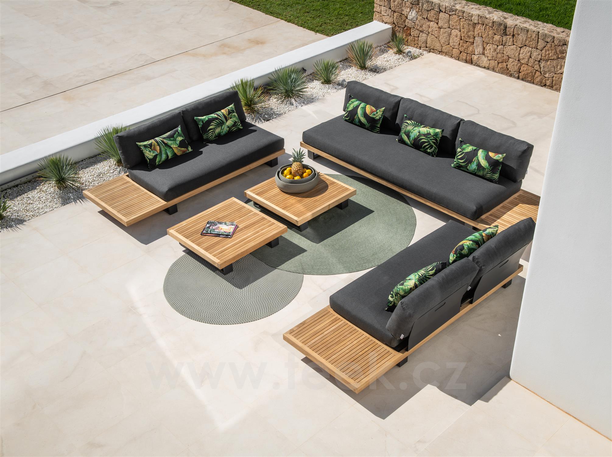 Plattform aus Teakholz, Gestell dunkelgrau lackiert, Farbe der Polsterung nach Muster, Sitzkissen für den Außenbereich.