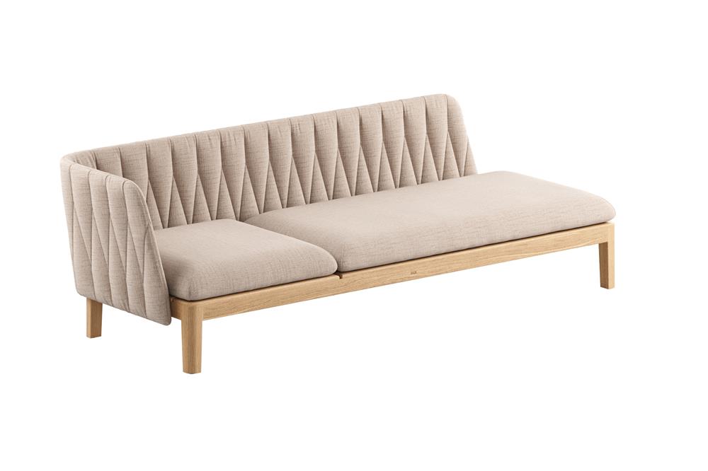Modulová venkovní sedací sestava v kombinaci teaku a venkovní tkaniny nebo umělého ratanu. Zahradní sedací nábytek lze kombinovat s jídelními křesly