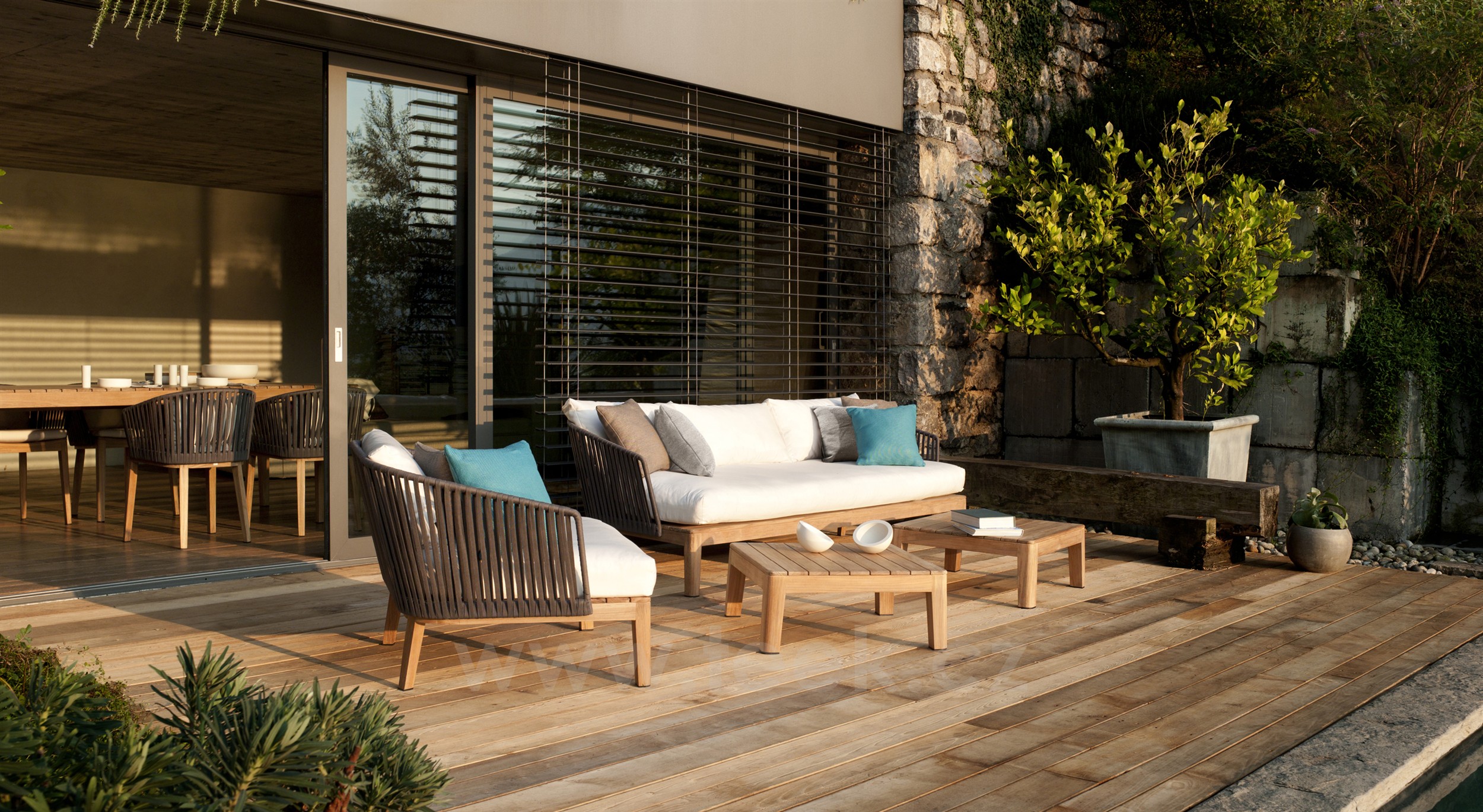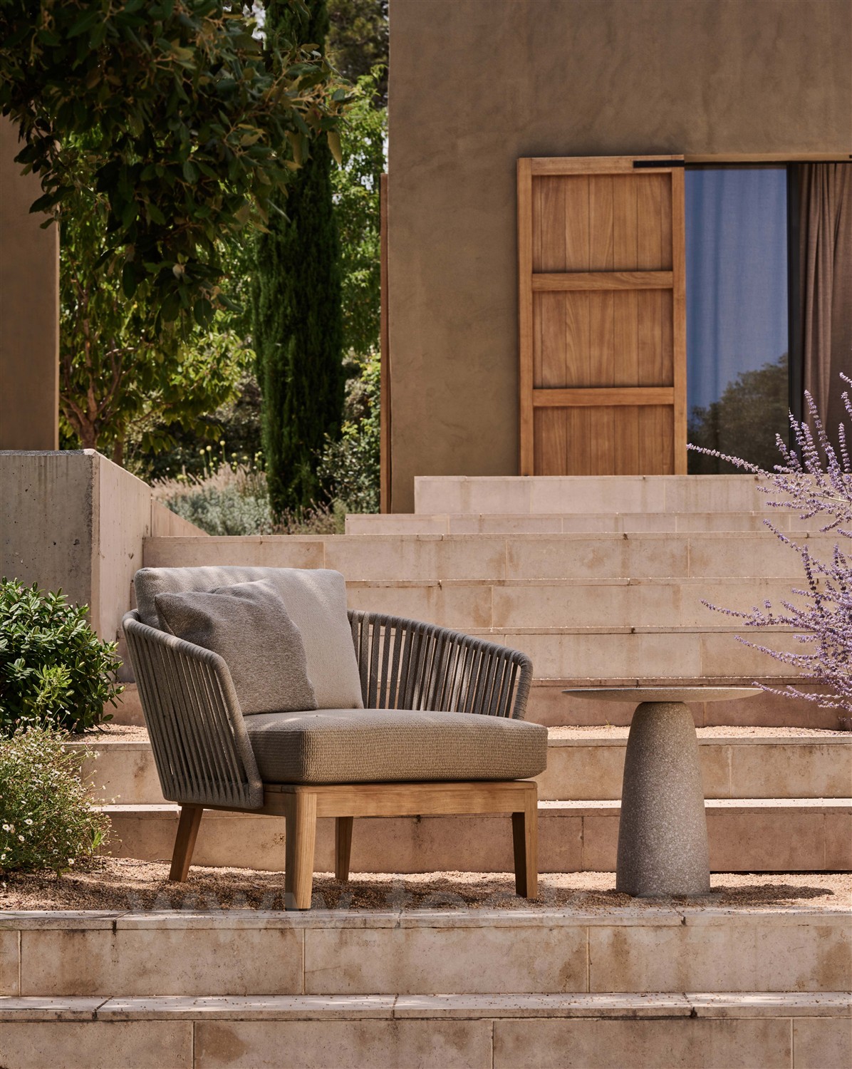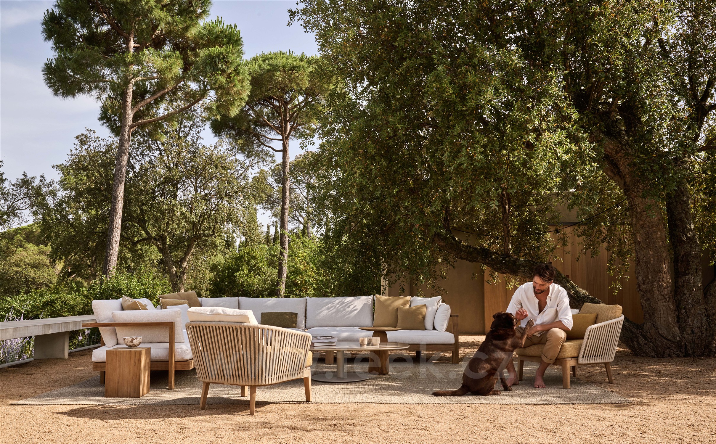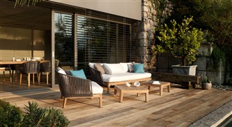 Nízke vonkajšie kreslo Mood značky Tribu z teakového dreva so širokým lankovým výpletom.