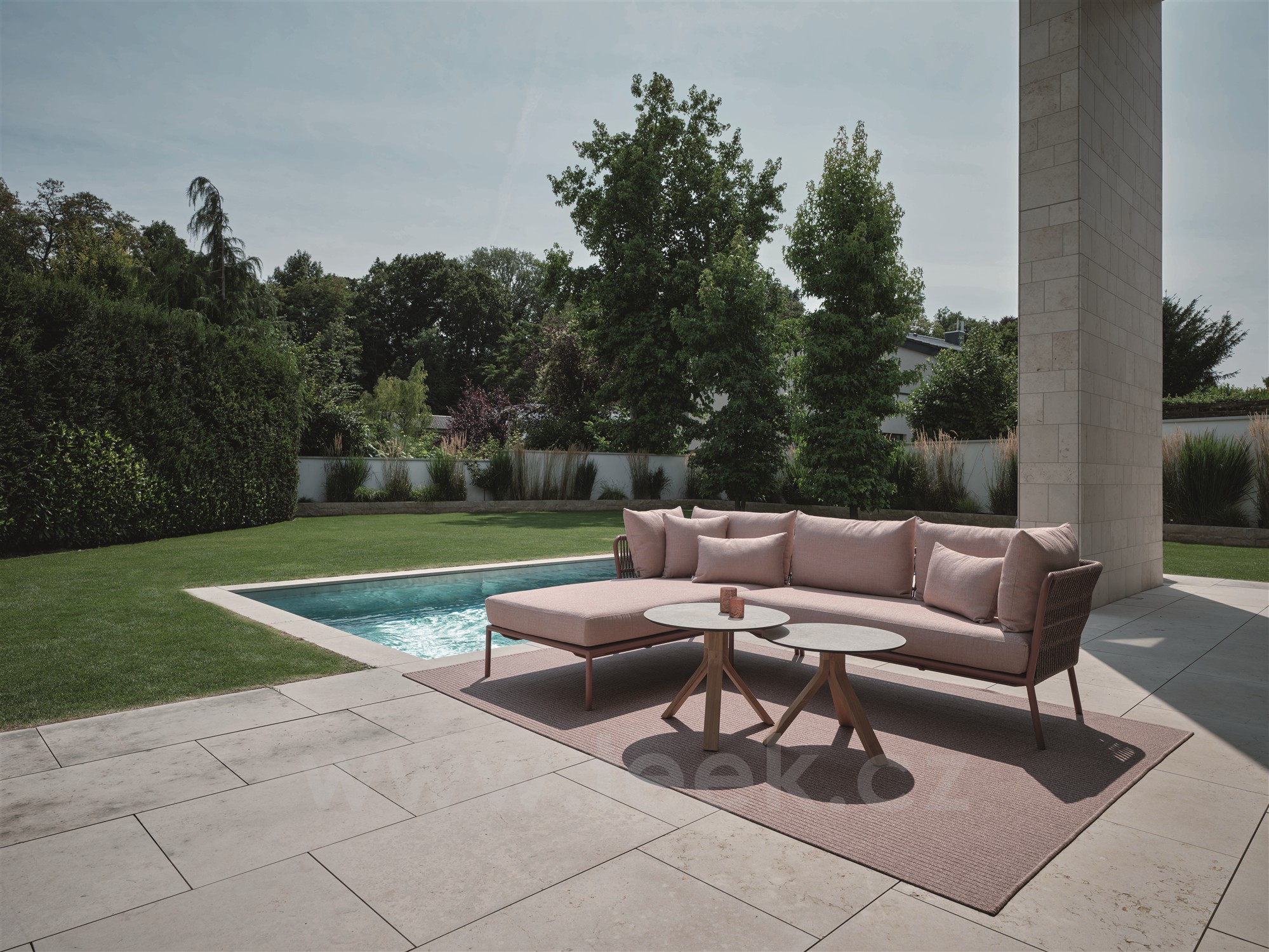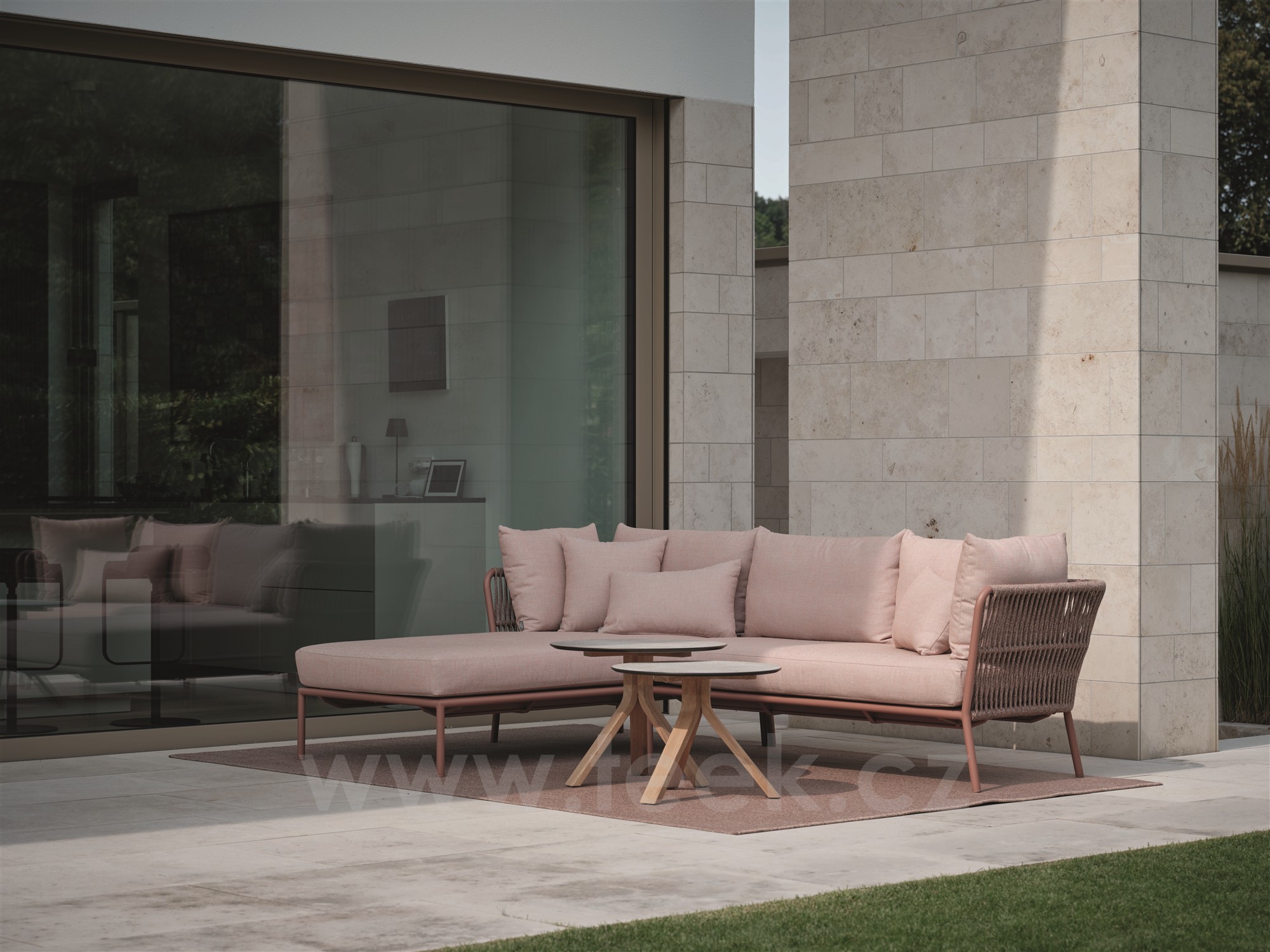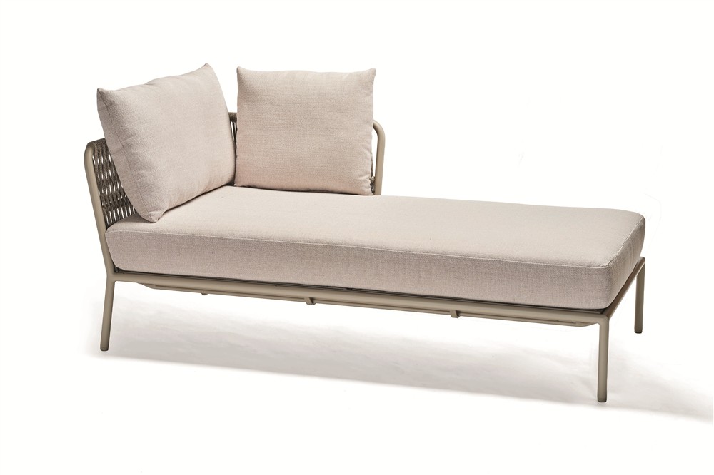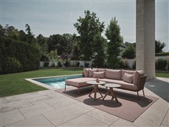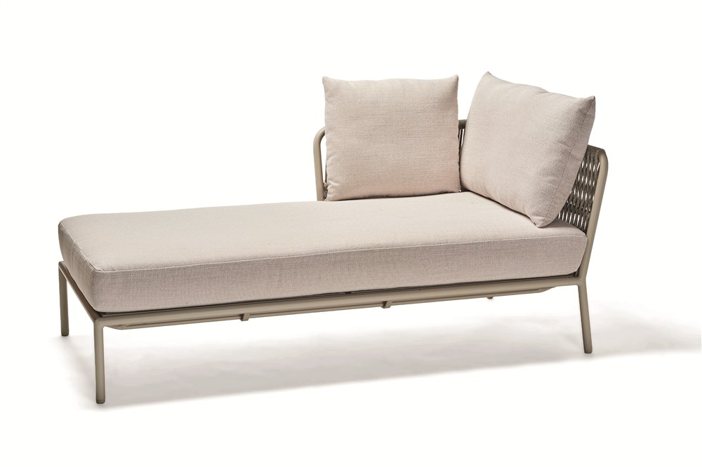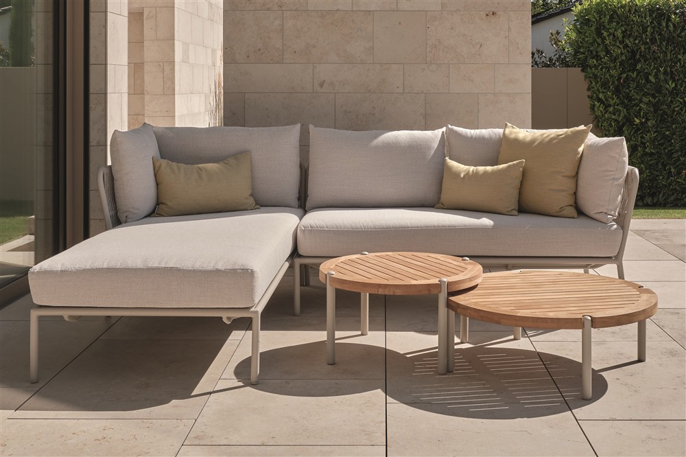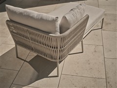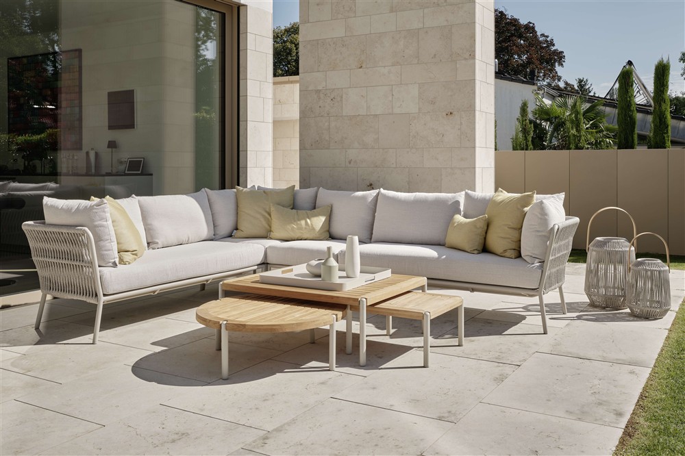 Elegantní modulární venkovní sedací sestava s lankovým výpletem a pohodlnými sedáky.
