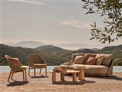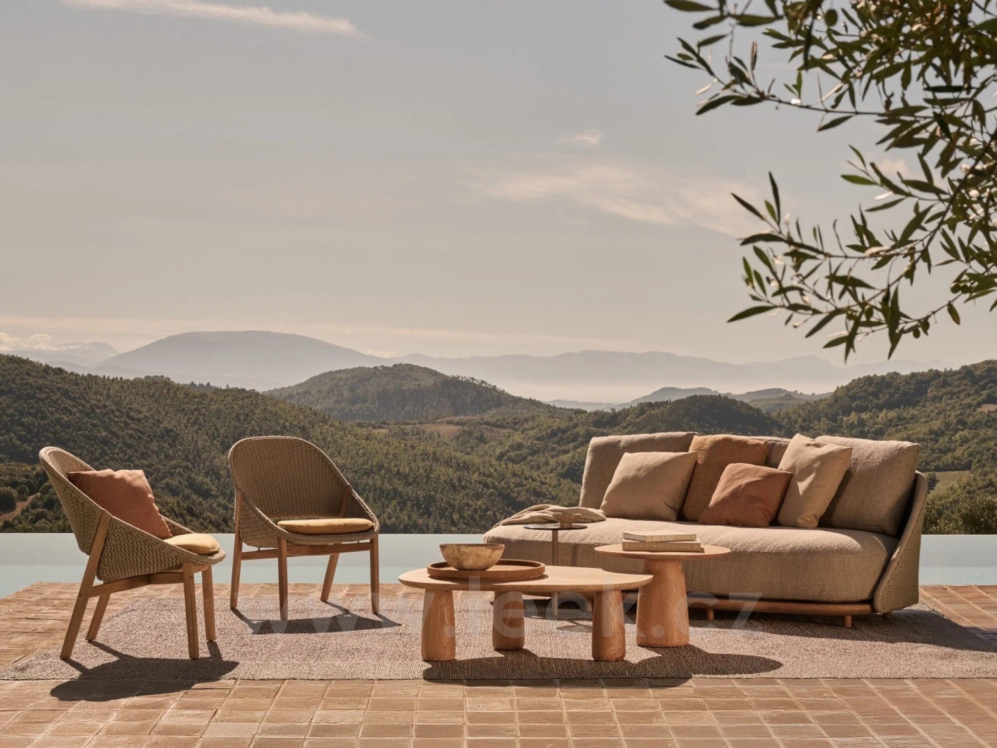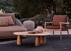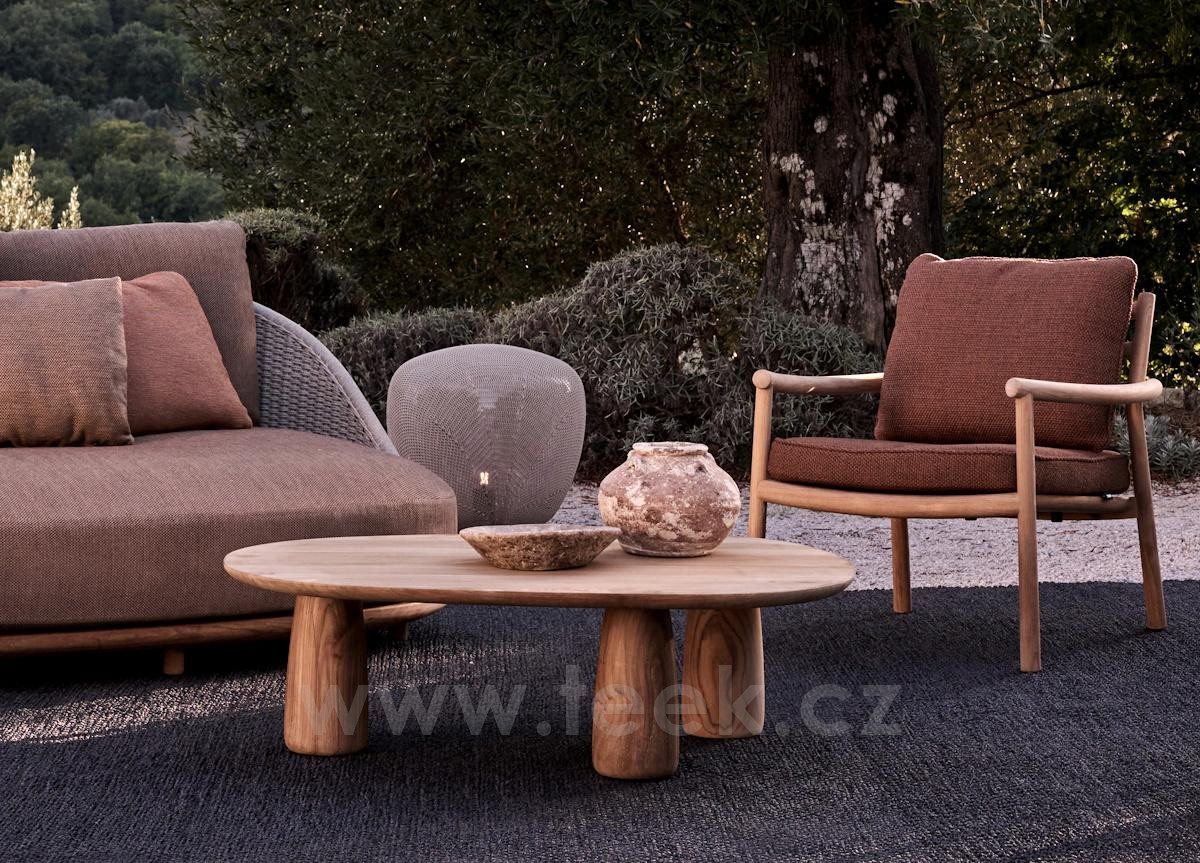 Nízké teakové odkládací a konferenční stolky Dunes značky Tribu s různými rozměry.