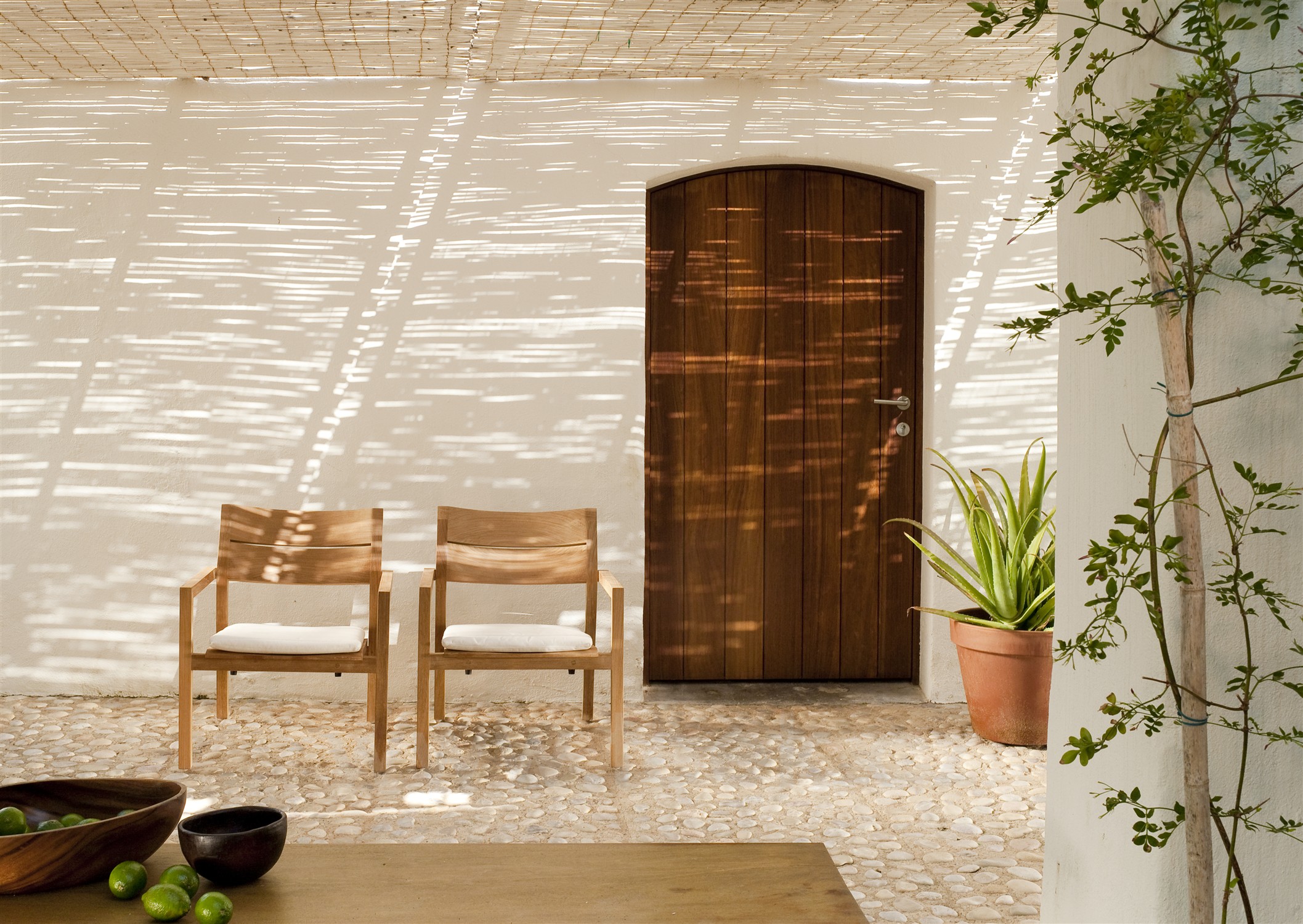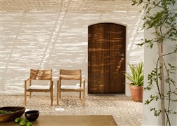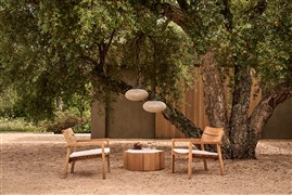 Stylové venkovní nízké křeslo z teakového dřeva.