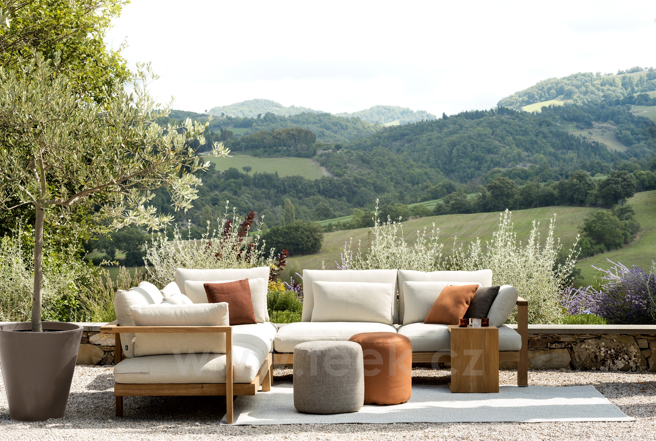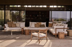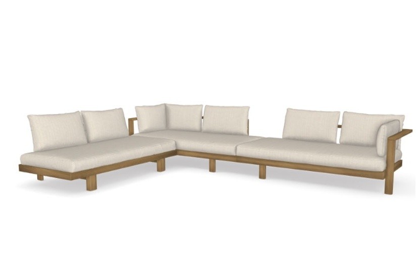 Pohodlná oblíbená luxusní venkovní sedací sestava z teaku značky Tribu.