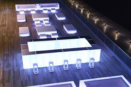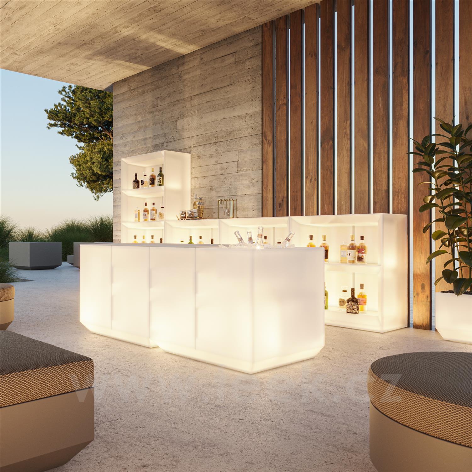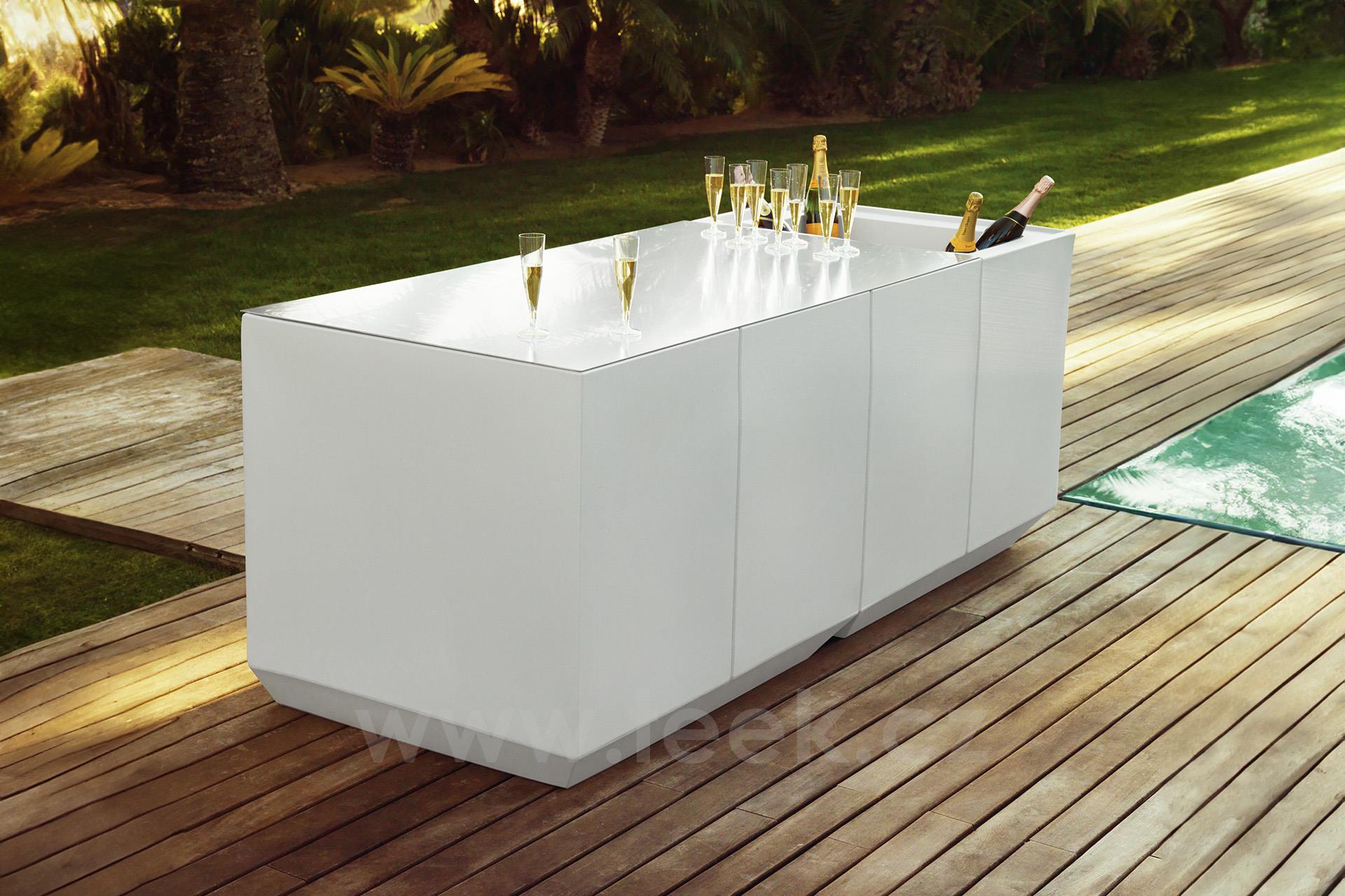 Venkovní jídelní sestava z kolekce Vela od španělské značky Vondom. Kolekce obsahuje také barový pult a policový systém, který je vhodný do hotelů a restaurací.