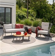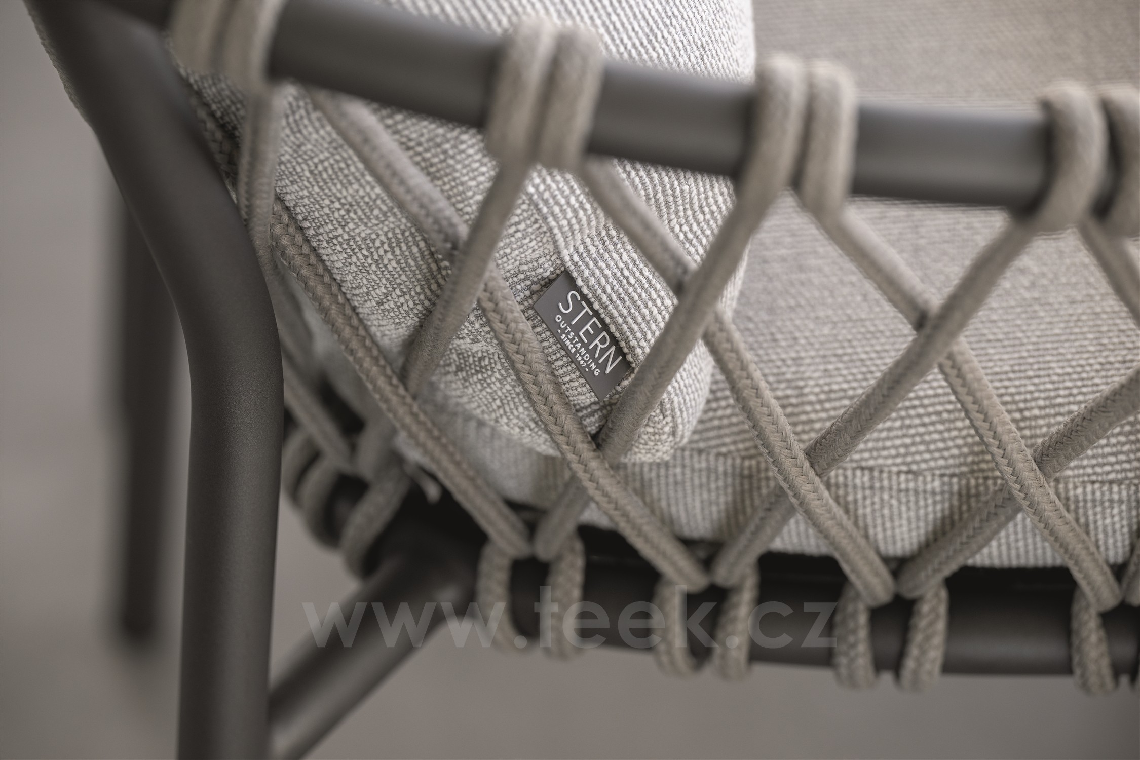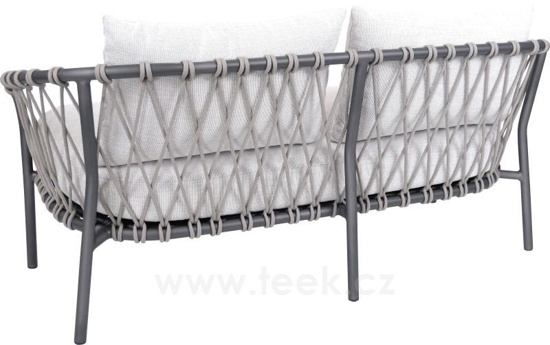 Rám pohovky je z lakovaného hliníku, který je opleten lankovým výpletem.