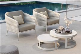 Nízké křeslo Fortuna Socks, Jati Kebon, 77x89x83 cm, rám hliník barva dune mat, výplet barva linen 14 mm, sedáky venkovní látka Sunproof Jalousie Beige